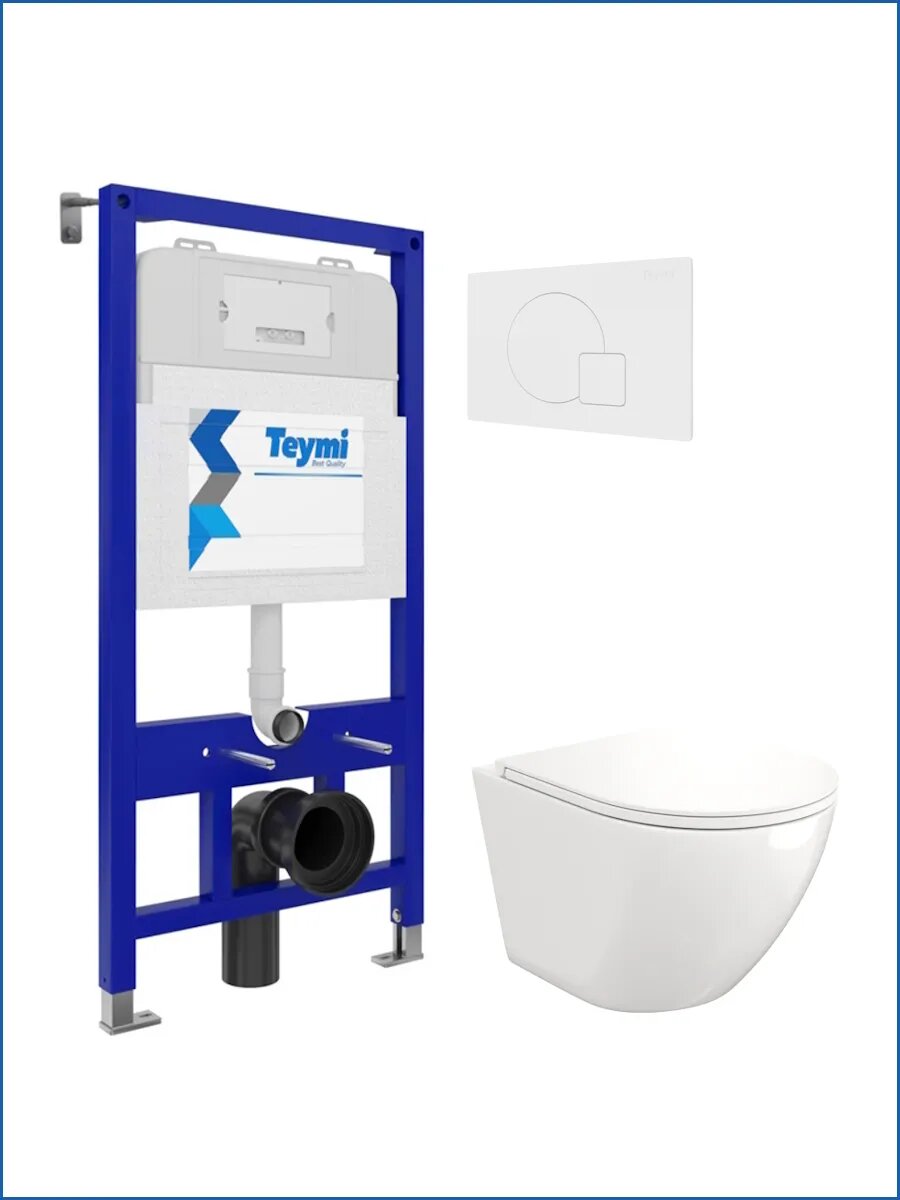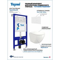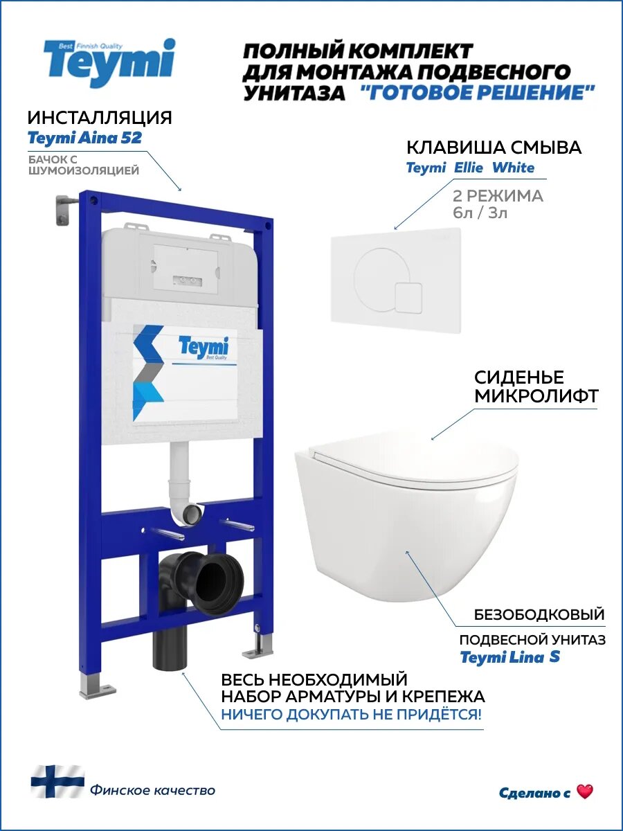 Комплект «Готовое решение» для установки инсталляции с подвесным унитазом включает: -- инсталляция TEYMI AINA 52 T70011 – монтажная рама из стального профиля толщиной 1.5 мм увеличенной ширины 52,5 см с дополнительными вертикальными усиливающими стойками, что позволяет выдерживать нагрузки до 400 кг; -- цельнолитой бачок скрытого монтажа, обшитый кожухом из пенопласта; -- клавиша смыва TEYMI ELLIE T70024WM, цвет белый матовый; -- унитаз подвесной TEYMI LINA S T40102; -- быстросъёмное сиденье с микролифтом; -- полный комплект арматуры для монтажа, включающий в себя уплотнительные кольца и манжеты, трубу смыва, фановый отвод с удлинителем, защитный кожух ревизионного окна с крепежной рамкой, закрывающей панелью и крышкой; -- полный комплект крепежа для установки, а именно: крепеж к стене, шпильки для унитаза, крепежная рамка, соединительные шпильки, толкатели; -- инструкция по установке и обслуживанию. Преимущества комплекта «Готовое решение» для установки инсталляции с подвесным унитазом: -- полная (максимальная) комплектация для установки - больше ничего докупать не придётся; -- все составляющие комплекта идеально подходят друг к другу; -- взаимозаменяемость rкомплектующих; -- рама покрыта суперпрочной порошковой краской с антикоррозионными свойствами; -- высота рамы может регулироваться с ходом до 20 см с помощью ножек, изготовленных из оцинкованной стали; -- сливной бачок скрытого монтажа изготовлен из современных полимерных материалов и является цельнолитым (бесшовным), что позволяет ему работать без протечек в течение всего периода эксплуатации; -- специальный кожух из пенопласта защищает сливной бачок от возникновения конденсата и создаёт дополнительную шумоизоляцию; -- лёгкость обслуживания сливного бачка достигается благодаря удобному ревизионному окну, скрытому за клавишей смыва; -- клавиша смыва имеет две кнопки и работает в режиме эконом / полный (объёмы смыва 3 / 6 литров); -- гарантия на весь комплект составляет 10 лет, а рама прослужит все 50. Комплект «Готовое решение» для установки инсталляции TEYMI AINA 52 с подвесным унитазом TEYMI LINA S T40102 и клавишей TEYMI ELLIE T70024WM в цвете белый матовый подобран специально для того, чтобы покупателям было проще сориентироваться в огромном выборе товаров для ванной комнаты. Оптимальное сочетание инсталляционной системы, клавиши смыва и подвесного унитаза позволит не задумываясь сделать правильный выбор. Инсталляция для подвесного унитаза от известного финского бренда TEYMI предназначена для оборудования санузлов и выгодно отличается своей надёжностью и простотой установки. Уважаемые покупатели, обращаем ваше внимание на то, что система инсталляции TEYMI AINA 52 может быть также укомплектована другими клавишами смыва или подвесными унитазами от бренда TEYMI (вы легко сможете найти их на этом сайте по указанным артикулам). Предлагаем вам рассмотреть варианты сочетания со следующими клавишами: : HELMI хром T70202CH : HELMI черная T70203BM : HELMI белая T70018WM : LINA хром T70102CH : LINA черная T70103BM : LINA белая T70019WM : AINA хром T70012CH : AINA черная T70013BM : AINA белая T70020WM : KATI хром T70701CH : KATI черная T70702BM : KATI белая T70021WM : ELLIE хром T70022CH : ELLIE черная T70023BM : ELLIE белая T70024WM Также просим обратить взгляд на наши лучшие безободковые подвесные унитазы: : SOLLI T40201 : LINA S T40102 : HELMI S T40302 : HELMI VORTEX T40303 : IVA T40601 : ELLIE T40802 : LINA MEDIA T40105 : LORI T40501 : KATI T40701 : HANNA PRO T40901 : HELMI S BLACK T40302MB : VITRA PRO T40806 : VITRA T40804 : DEMI T40208 : LINA VORTEX T40110 : RI
