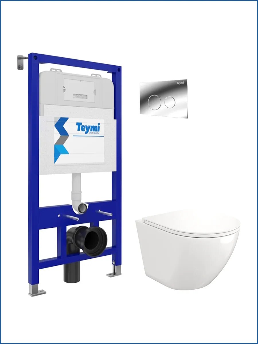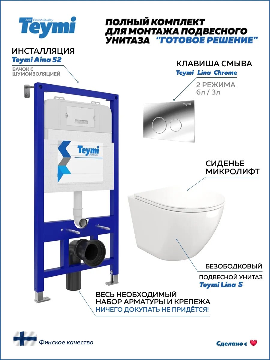 Купить Инсталляция с унитазом комплект 5 в 1 Teymi унитаз подвесной безободковый Lina S кнопка хром T70719 с доставкой по всей России.