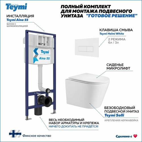 Инсталляция с унитазом комплект 5 в 1 Teymi унитаз подвесной безободковый Solli кнопка белая F13540