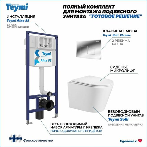 Купить Инсталляция с унитазом комплект 5 в 1 Teymi унитаз подвесной безободковый Solli кнопка хром F13538 с доставкой по всей России.