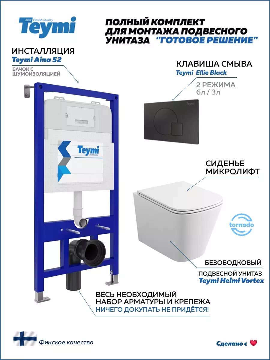 Комплект «Готовое решение» для установки инсталляции TEYMI AINA 52 с подвесным унитазом TEYMI HELMI VORTEX T40303 и клавишей TEYMI ELLIE T70023BM в цвете черный матовый подобран специально для того, чтобы покупателям было проще сориентироваться в огромном выборе товаров для ванной комнаты. Оптимальное сочетание инсталляционной системы, клавиши смыва и подвесного унитаза позволит не задумываясь сделать правильный выбор. Инсталляция для подвесного унитаза от известного финского бренда TEYMI предназначена для оборудования санузлов и выгодно отличается своей надёжностью и простотой установки.