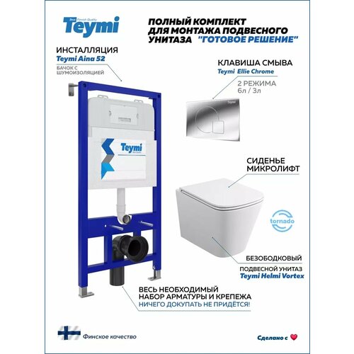 Комплект «Готовое решение» для установки инсталляции TEYMI AINA 52 с подвесным унитазом TEYMI HELMI VORTEX T40303 и клавишей TEYMI ELLIE T70022CH в цвете хром подобран специально для того, чтобы покупателям было проще сориентироваться в огромном выборе товаров для ванной комнаты. Оптимальное сочетание инсталляционной системы, клавиши смыва и подвесного унитаза позволит не задумываясь сделать правильный выбор. Инсталляция для подвесного унитаза от известного финского бренда TEYMI предназначена для оборудования санузлов и выгодно отличается своей надёжностью и простотой установки.