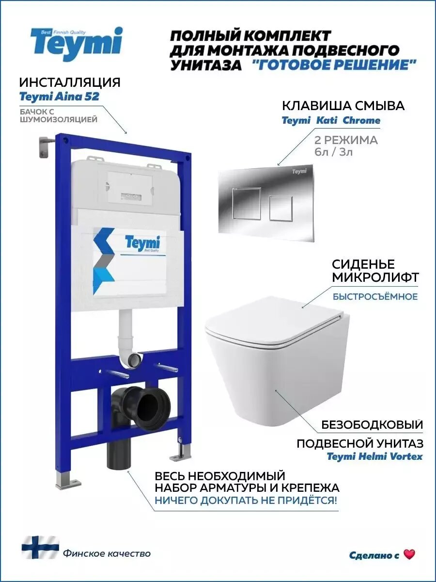 Комплект «Готовое решение» для установки инсталляции TEYMI AINA 52 с подвесным унитазом TEYMI HELMI VORTEX T40303 (инновационная система вихревого смыва) и клавишей TEYMI KATI T70701CH в цвете хром подобран специально для того, чтобы покупателям было проще сориентироваться в огромном выборе товаров для ванной комнаты. Оптимальное сочетание инсталляционной системы, клавиши смыва и подвесного унитаза позволит не задумываясь сделать правильный выбор. Инсталляция для подвесного унитаза от известного финского бренда TEYMI предназначена для оборудования санузлов и выгодно отличается своей надёжностью и простотой установки.