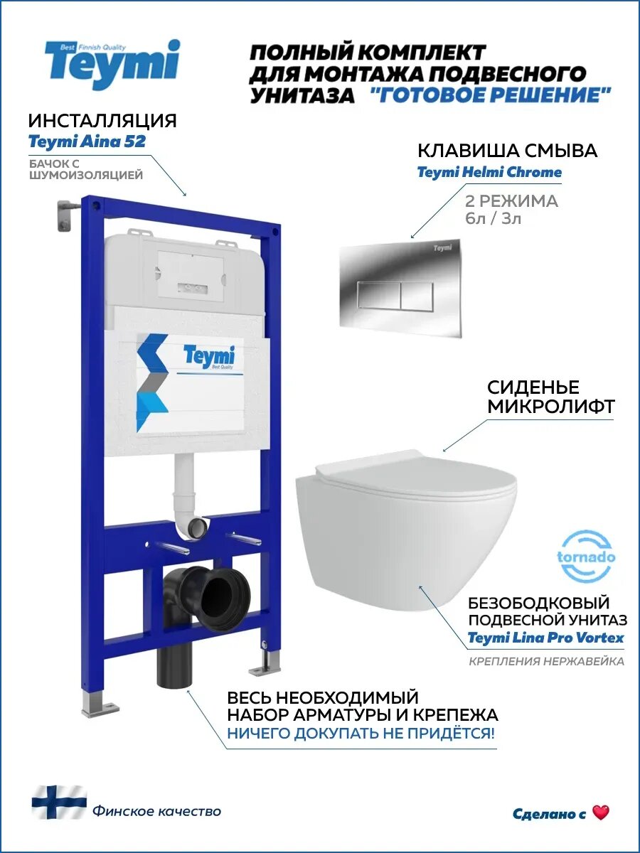 Инсталляция с унитазом комплект 5 в 1 Teymi унитаз подвесной безободковый торнадо Lina Pro Vortex кнопка хром F14448: сравнение цен, характеристики, фото, актуальное наличие и цены.
