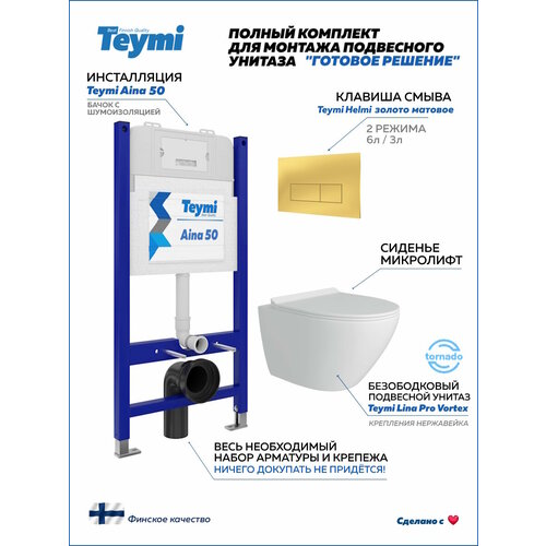 Купить Инсталляция с унитазом комплект 5 в 1 Teymi унитаз подвесной безободковый торнадо Lina Pro Vortex кнопка золото F16141 с доставкой по всей России. Инсталляция с унитазом комплект 5 в 1 Teymi унитаз подвесной безободковый торнадо Lina Pro Vortex кнопка золото F16141: сравнение цен, характеристики, фото, актуальное наличие и цены.