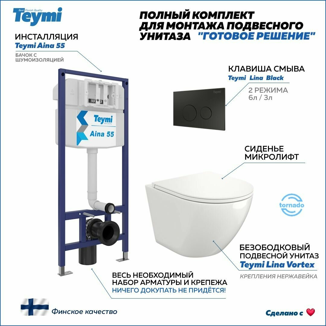 Инсталляция с унитазом комплект 5 в 1 Teymi унитаз подвесной безободковый торнадо Lina Vortex кнопка черная F13821