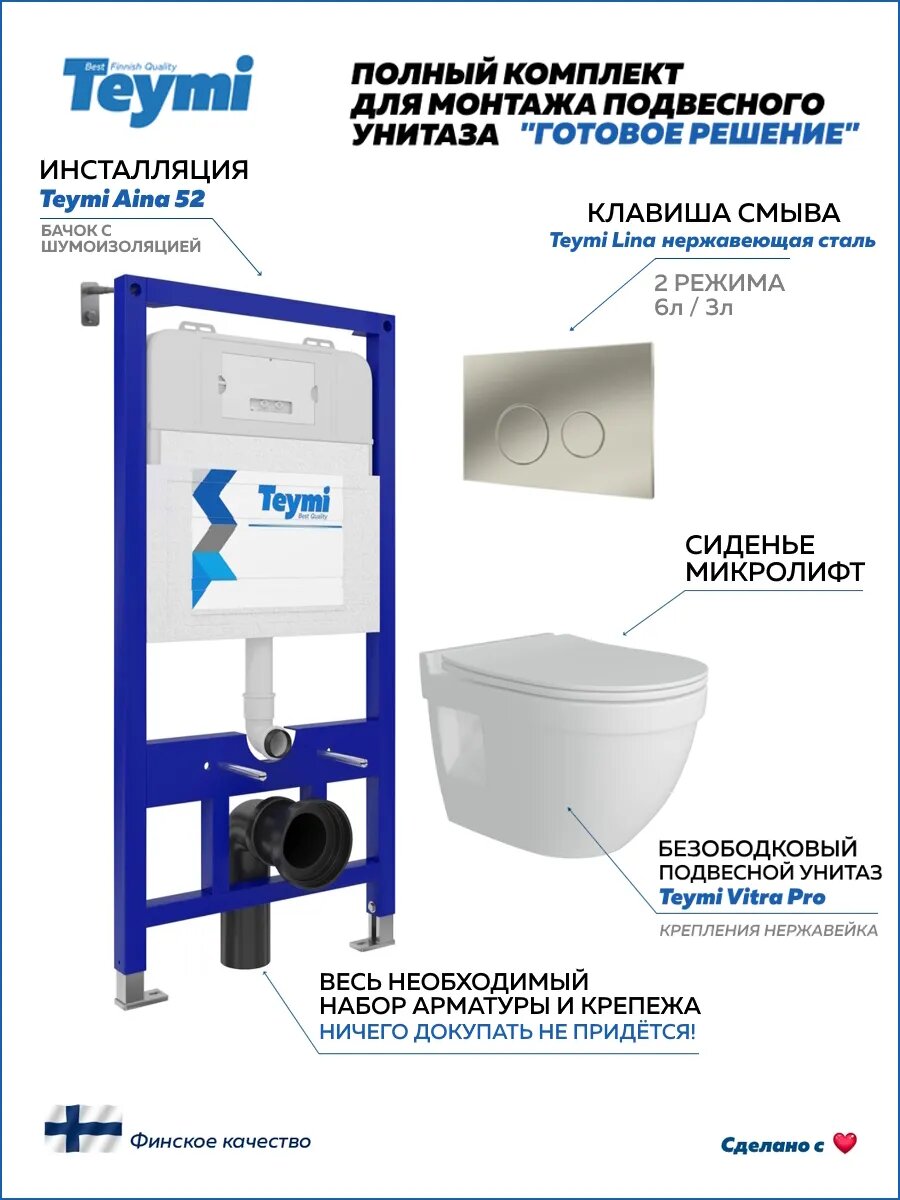 Инсталляция с унитазом комплект 5 в 1 Teymi унитаз подвесной безободковый Vitra Pro кнопка нержавеющая сталь F13353: сравнение цен, характеристики, фото, актуальное наличие и цены.