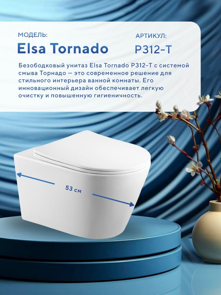 - Подвесной унитаз подвесной безободковый Amore di Mare Elsa Tornado P312-T — безободковый унитаз с инновационной системой смыва "Торнадо", которая обеспечивает мощный поток воды, эффективно очищающий всю чашу. Такая система смыва способствует более высокой гигиеничности и экономии воды.