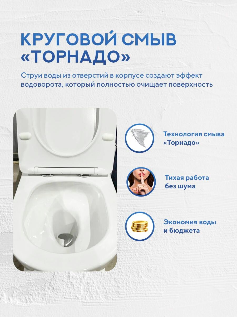 Этот комплект представляет собой современное решение для ванной комнаты, сочетающее в себе высокую функциональность, гигиеничность и стильный внешний вид благодаря системе смыва "Торнадо" и скрытой инсталляции.