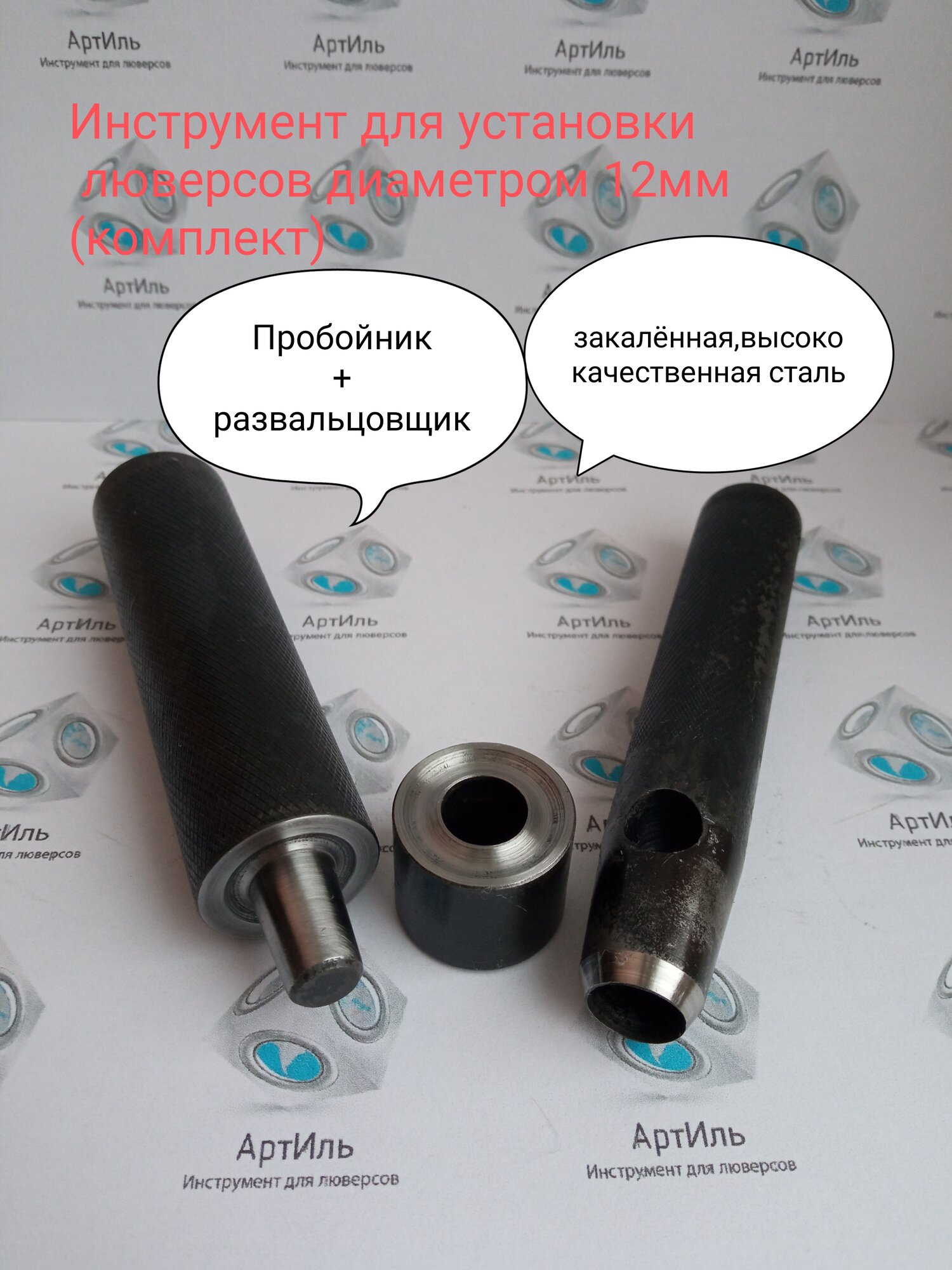 Наш профессиональный инструмент для установки люверсов с внутренним диаметром 12 мм - это именно то, что вам необходимо для удобной и быстрой установки люверсов. Комплект поставки включает пробойник, матрицу наковальню и развальцовщик, обеспечивающие превосходную точность и качество установки люверсов. В плотном материале таком как тент, ткань или например пластик. Перед установкой люверса нужно прорубить или прорезать отверстие. Наковальня должна находиться на ровной горизонтальной, не пружинящей поверхности, потом установить на наковальню основную часть люверса, сверху, надеть материал, далее установить на основание стопорное кольцо, потом развальцовщик сверху помещается в отверстие люверса и бьете молотком несколько раз до полной установки. Вы ищете эффективный и надежный инструмент для установки люверсов? У нас есть то, что нужно! При правильной установке, люверс будет крепко держаться в материале. Инструмент для установки люверсов 12 мм может использоваться в различных отраслях, таких как производство спецодежды, изготовление рекламных баннеров, производство автомобильных тентов, а также для установки люверсов в кожаные изделия и другие изделия из текстиля. Этот инструмент предназначен для профессионального использования, облегчает и ускоряет процесс установки люверсов, что повышает эффективность работы.
