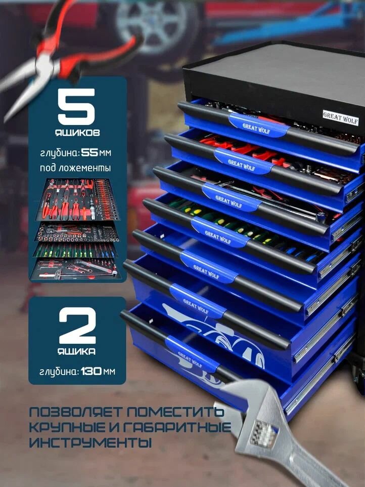 Инструментальная тележка Great Wolf 7 ящиков, увеличенные колеса с тормозом, ЦЗ, с инструментом, 324 шт GW-7ST2 Blue: сравнение цен, характеристики, фото, актуальное наличие и цены.