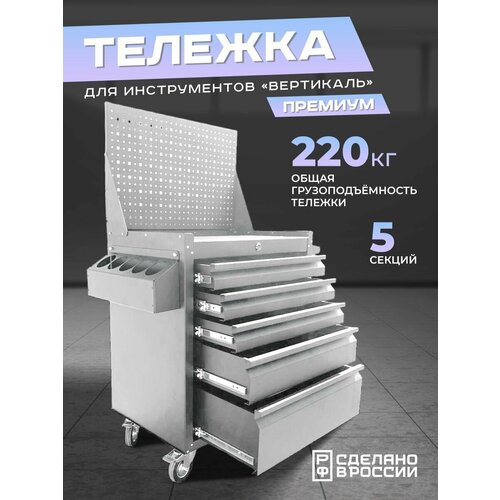 Тележка для инструментов передвижная "Вертикаль Премиум" с 5 секциями и общей грузоподъемностью 220кг - это идеальное решение для любого мастера, который хочет сохранить свои инструменты в безопасности и порядке.