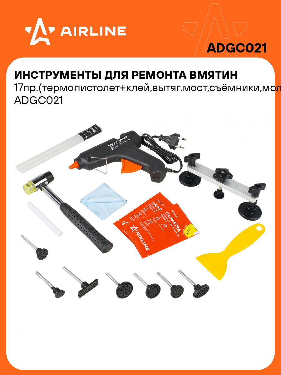 Инструменты для ремонта вмятин 17пр.(термопистолет+клей, вытяг. мост, съёмники, молоток, салфетки) ADGC021 AIRLINE: сравнение цен, характеристики, фото, актуальное наличие и цены.