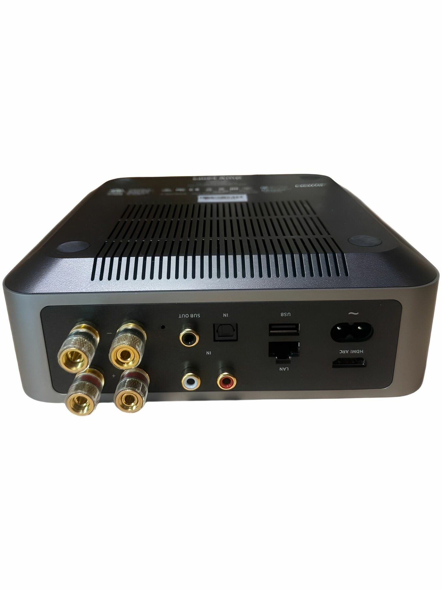 Коммутационный арсенал усилителя WiiM Amp включает линейный аналоговый вход на разъёмах RCA, цифровой оптический вход и порт HDMI ARC. Кроме двух пар винтовых акустических терминалов для подключения колонок, здесь есть выход на активный сабвуфер.