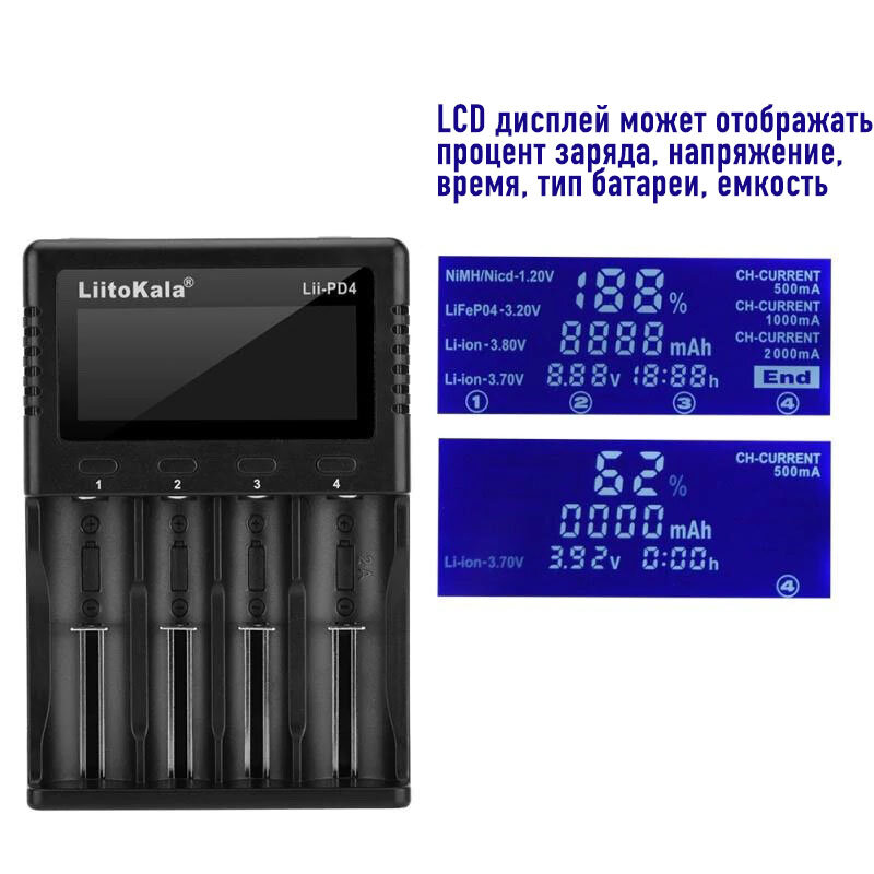 Автоматически распознает литий - электрические (Li - Ion 3.7V) батареи и никель - водородные (Ni - MH) батареи, вручную выбирает фосфат железа (LiFePO4) батареи и Li - Ion 3.80V батареи (IMR)