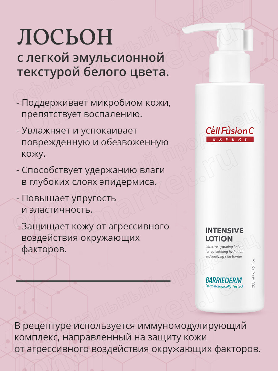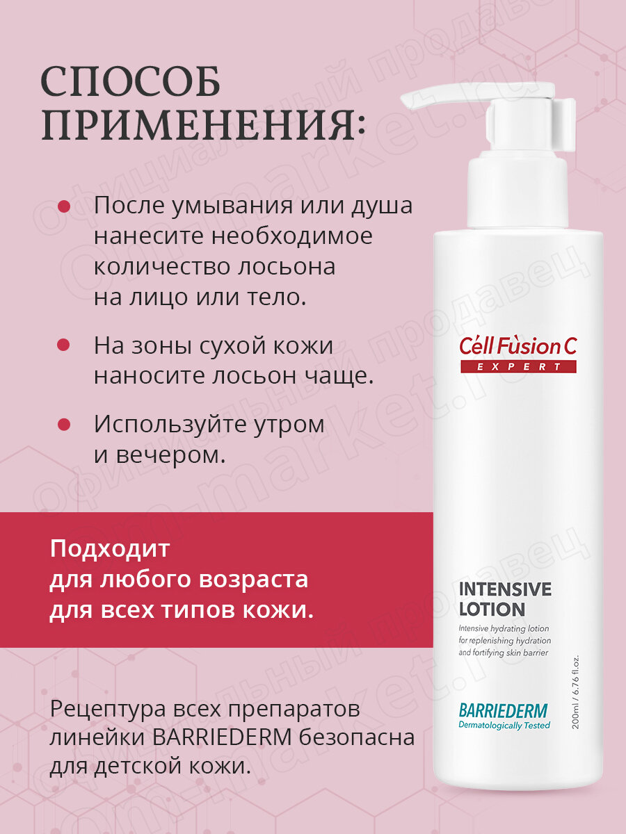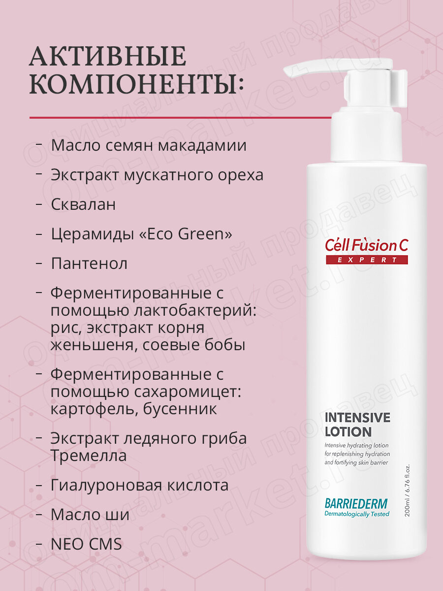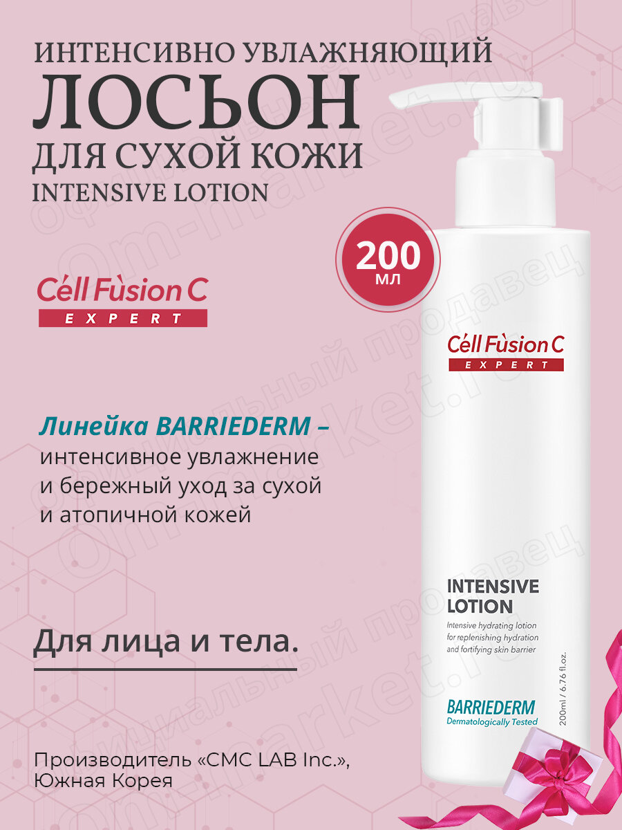 Интенсивно увлажняющий лосьон Intensive Lotion от премиального корейского бренда Cell Fusion C — это профессиональное средство для ухода за сухой, чувствительной и атопичной кожей. Продукт сочетает передовые разработки в области косметологии с натуральными активными компонентами, обеспечивая комплексный уход и долговременный эффект. Подходит как лосьон для лица и лосьон для тела — универсальное решение для ежедневного ухода за кожей.