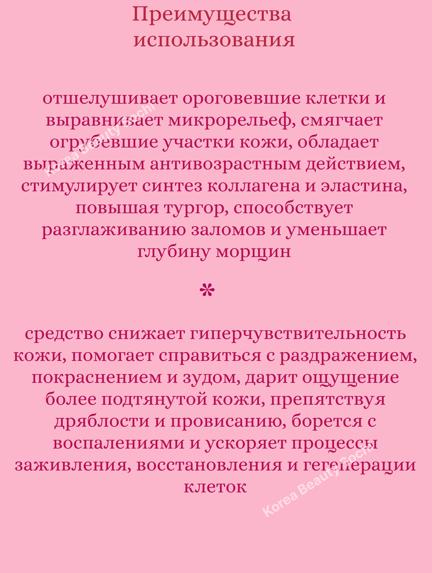 | Эффект | восстановление, выравнивание микрорельефа, лифтинг, омоложение, отбеливание, питание, повышение упругости, снятие отеков, тонизирование, увлажнение, улучшение цвета |