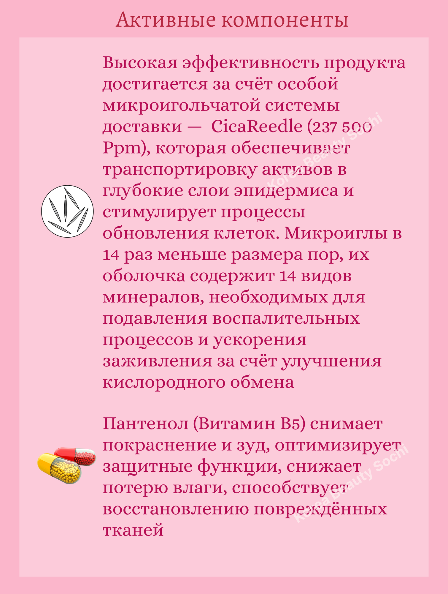 | Способ применения | во время вечернего ухода нанесите необходимое количество средства на предварительно очищенную кожу, распределите пальцами и дождитесь полного впитывания. Продолжите уход этапами тонизирования и увлажнения. В дневное время используйте солнцезащитное средство SPF50 PA++++. Внимание! Бустер-сыворотка с микроиглами может вызывать ощущение покалывания после нанесения |