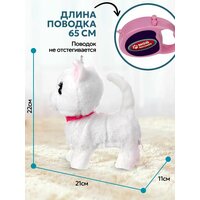 игрушка имеет удобный пульт-поводок для управления, работает в двух режимах: первый - лает, двигает головой и виляет хвостиком, второй - исполняет 5 песенок о дружбе, произносит занимательные фразы, ходит и виляет хвостиком, развивает социально-коммуникативные навыки, фантазию, речь и мышление, учит ребенка заботиться о домашнем питомце, работает от 3-х батареек типа АА