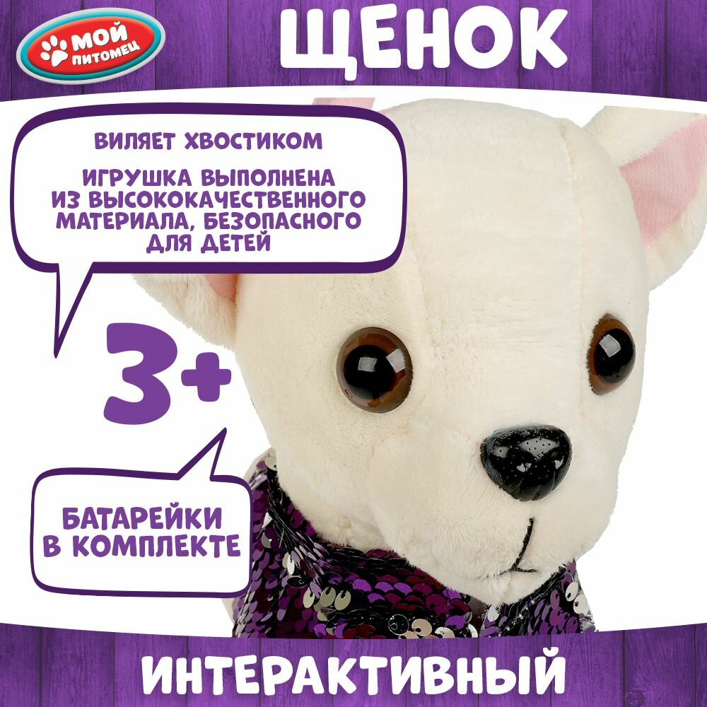 Этот очаровательный щенок совсем как настоящий. У Бетти красивые глазки и умилительная мордочка. Светлая шёрстка щенка очень приятная на ощупь. На Бетти одет наряд из блестящих пайеток и розовый бантик на голове. Милая игрушка подарит малышу массу положительных эмоций и научит заботиться о домашнем любимице.