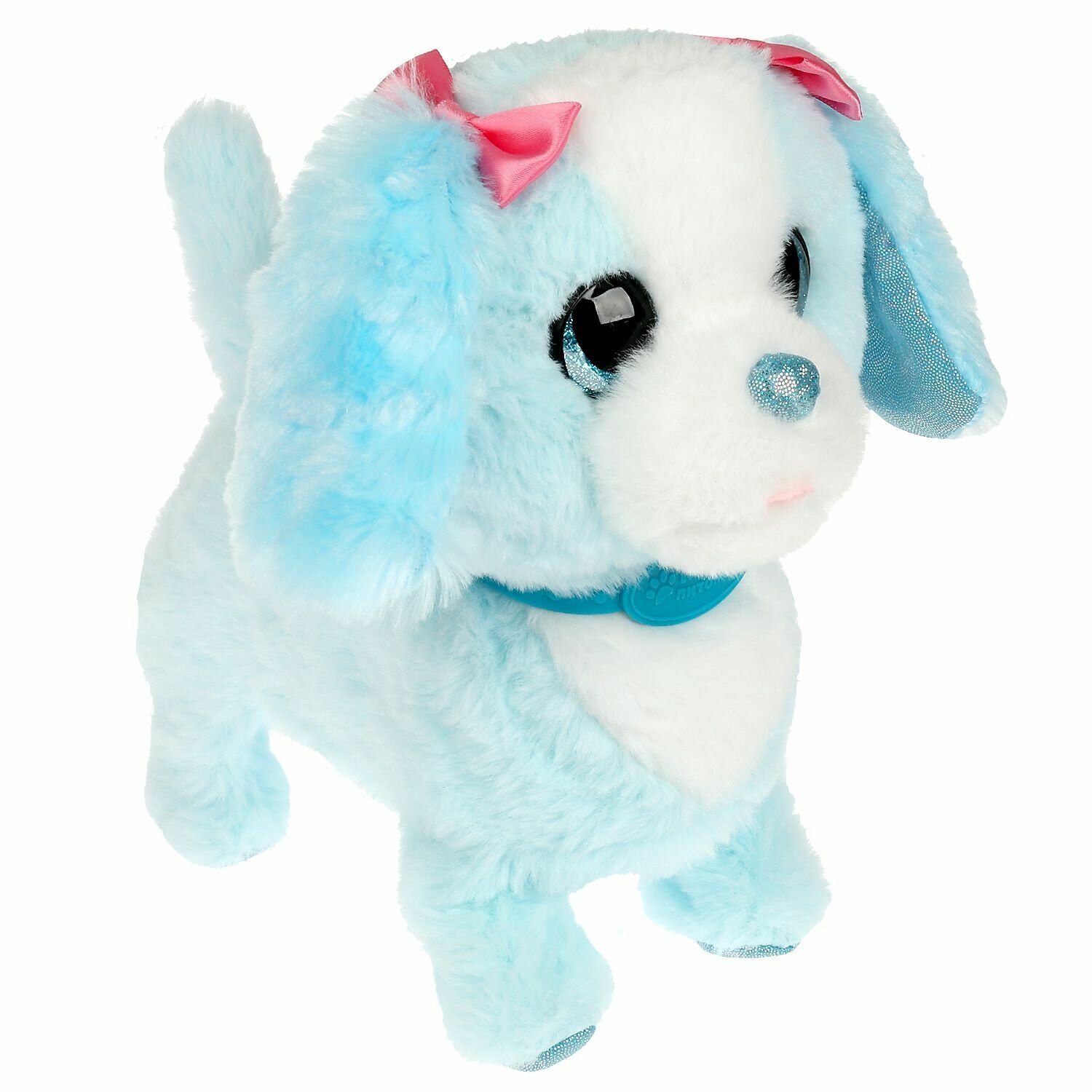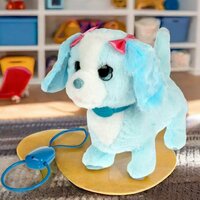 Этот очаровательный щенок совсем как настоящий. У Миффи красивые глазки и умилительная мордочка. Голубая с белым шёрстка щенка очень мягкая и приятная на ощупь. На Миффи надет стильный голубой ошейник и 2 розовых бантика. Милая игрушка подарит малышу массу положительных эмоций и научит заботиться о домашнем любимице.