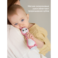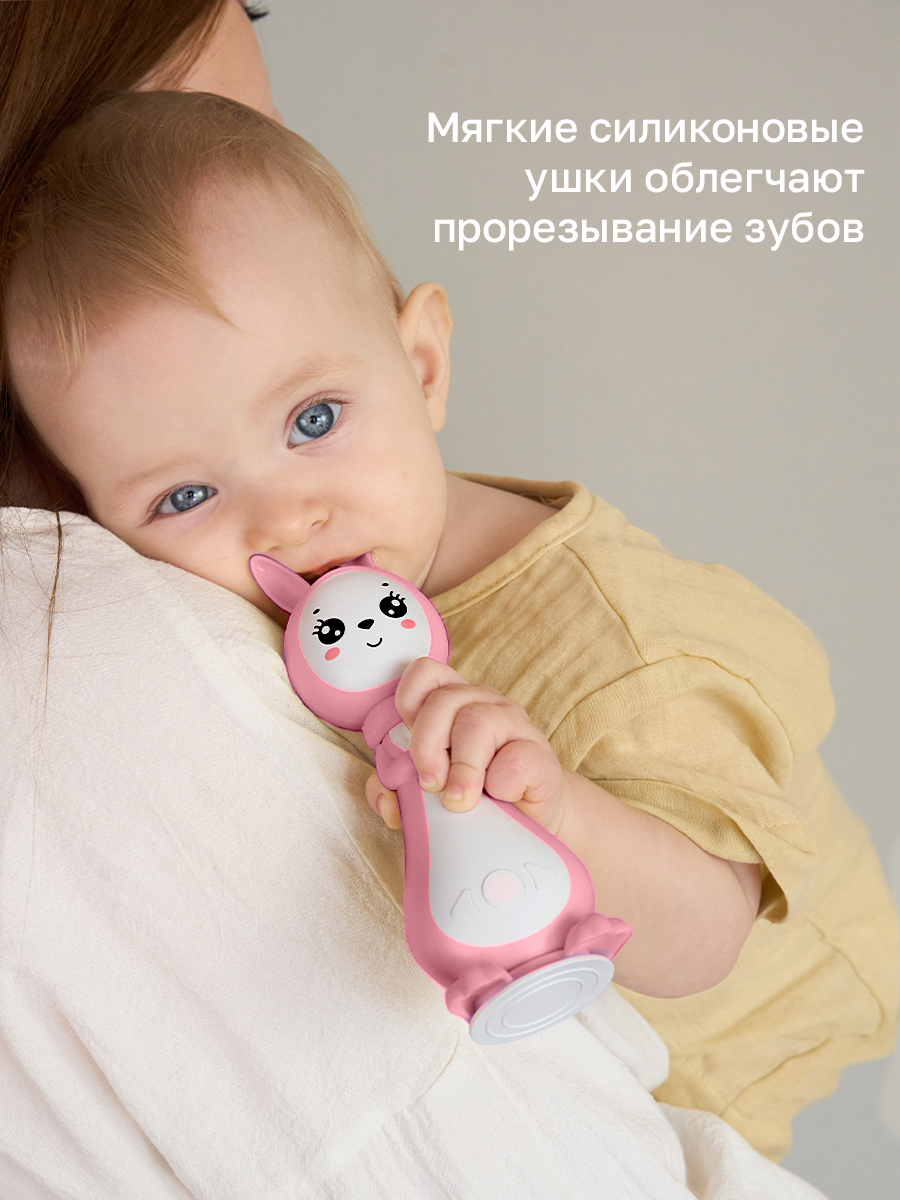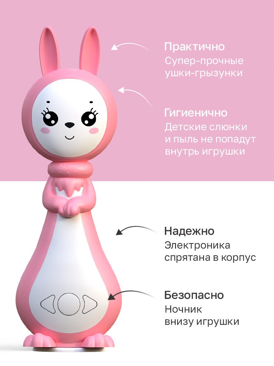 Интерактивная игрушка обладает рядом интерактивных функций: успокаивающие мелодии, силиконовые ушки для облегчения дискомфорта при прорезывании зубов, грызунок для развития моторики и ночник, который светится разными цветами и не раздражает глазки.