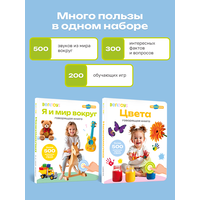 В комплекте идут две музыкальные книги "Нажималка" - "Я и Мир Вокруг" и "Цвета". В каждой книге более 500 звуков, фраз и забавных заданий, которые знакомят детей с миром, животными, транспортом и многим другим.