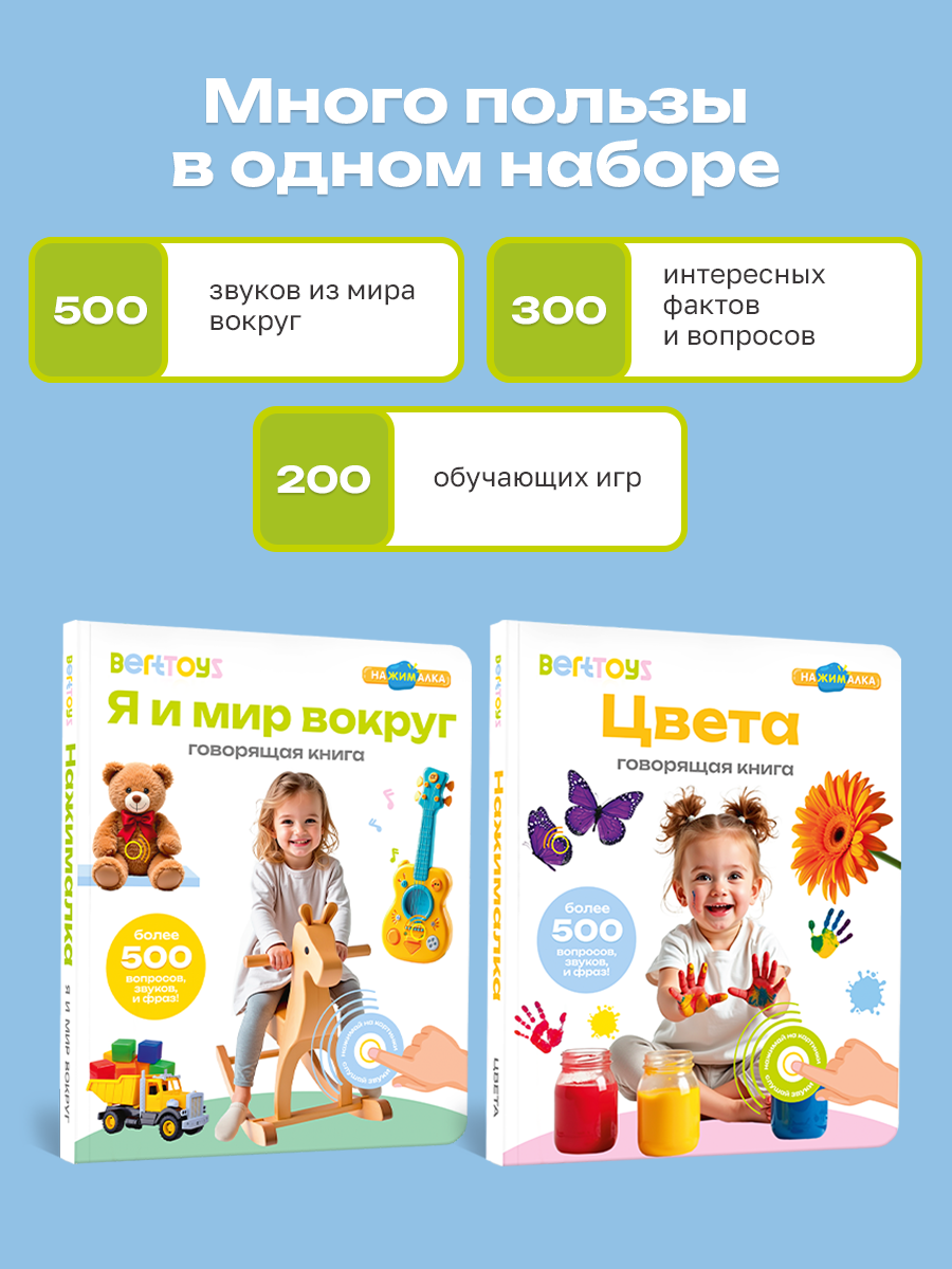 Интерактивная книжка BertToys "Нажималка" 2 в 1 "Я и Мир Вокруг + Цвета" - это развивающая игрушка для детей от 1 до 3 лет, которая поможет малышам в изучении окружающего мира, цветов и бытовых и социальных навыков.