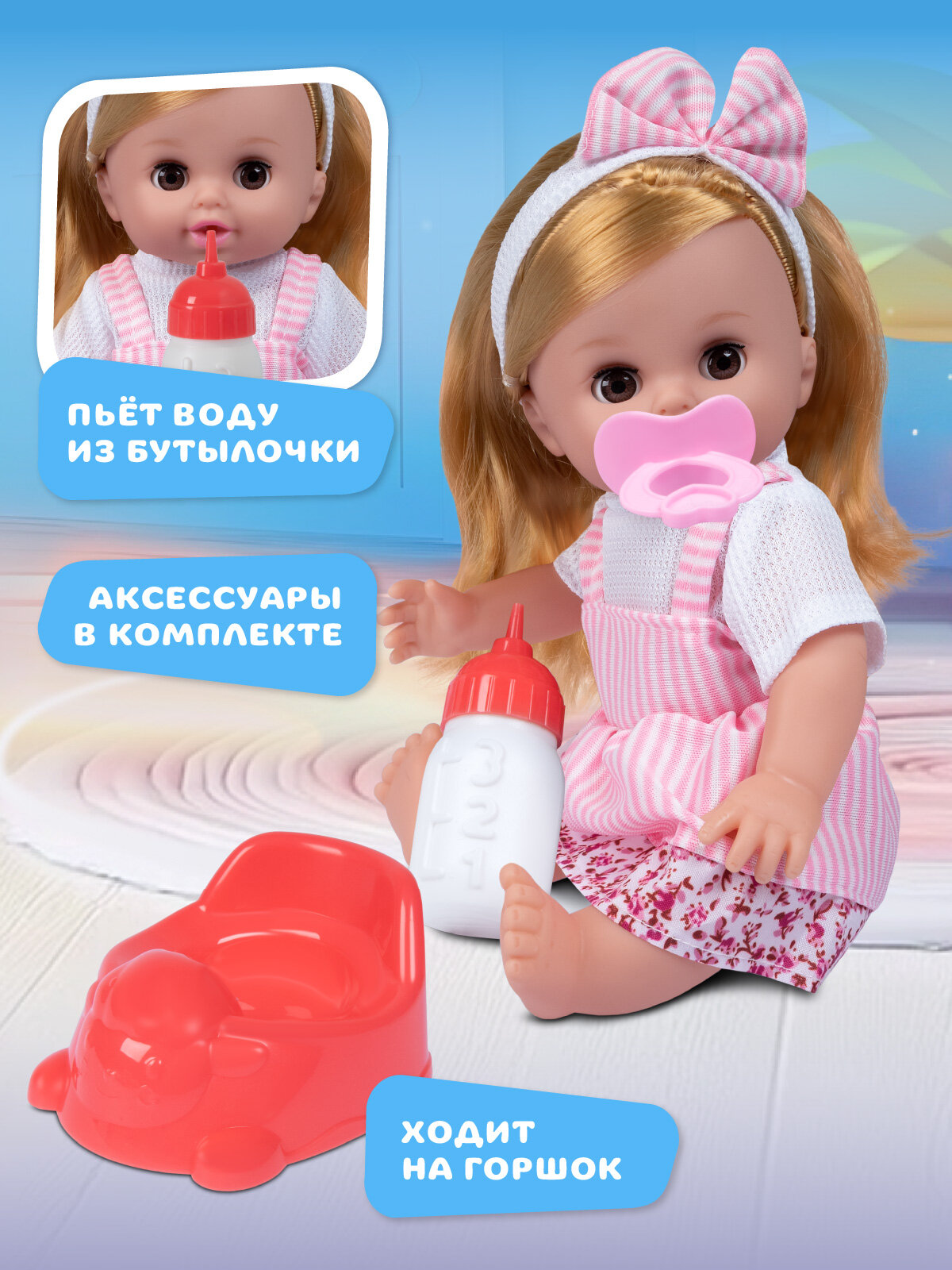 | В комплекте | бутылочка, горшок, подгузник, пустышка |