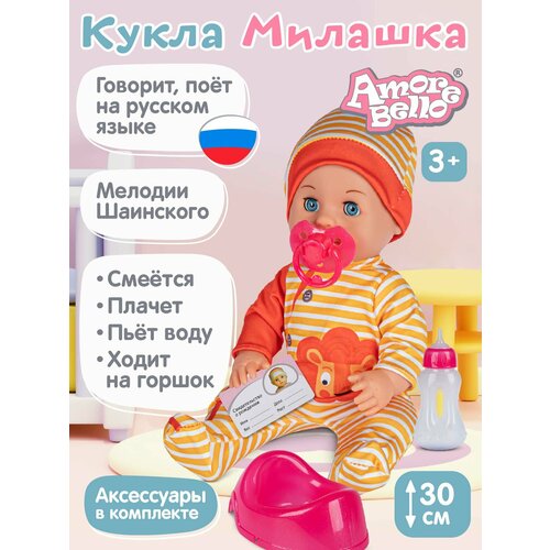 Говорящая кукла воспроизводит 8 мелодий В. Шаинского, а также произносит фразы на русском языке, среди них "мама", "папа", "я хочу спать" и другие, издаёт различные звуки младенца, а также рассказывает стишок и поёт песенки.