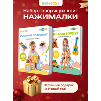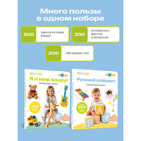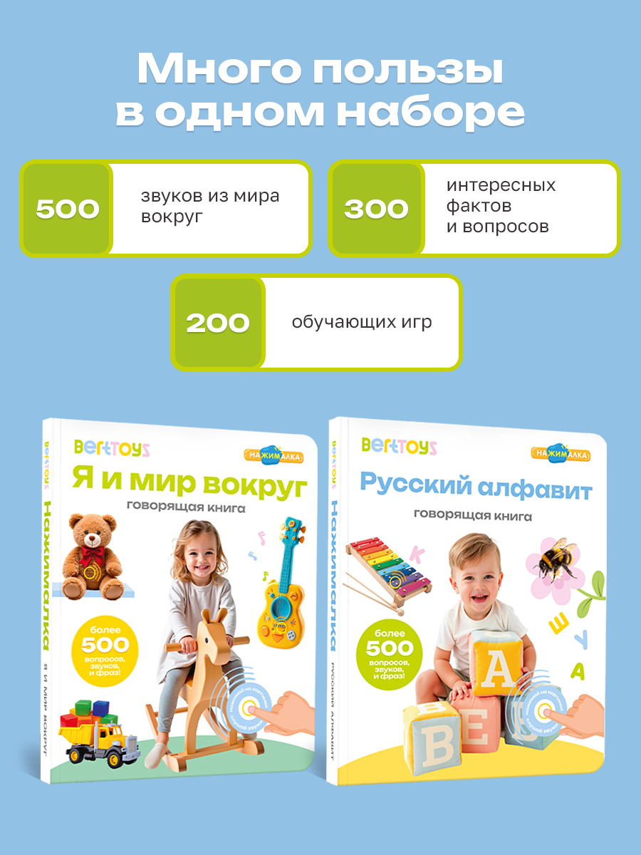 Интерактивная музыкальная игрушка-книжка "Набор Нажималка 2в1: "Я и Мир вокруг + Русский алфавит" от BertToys – это развивающий и обучающий инструмент для детей от 1 года. В комплект входят две музыкальные книги, каждая из которых содержит более 500 звуков, фраз и забавных заданий.