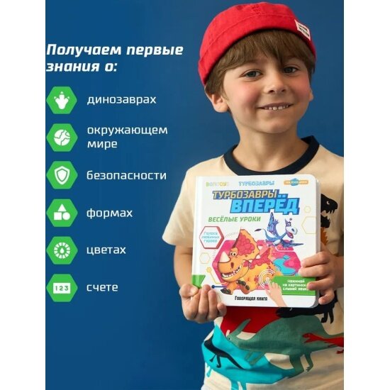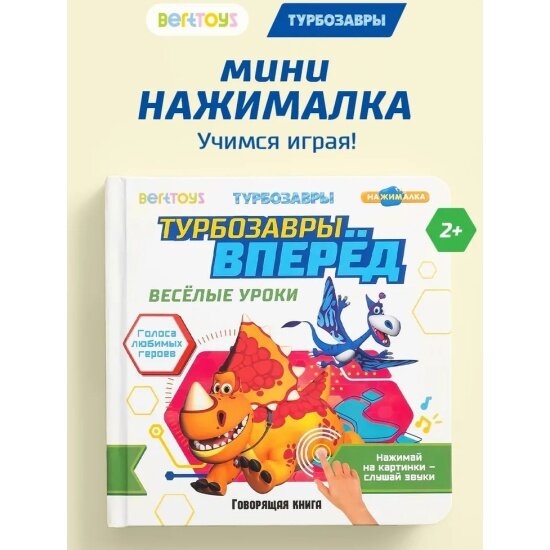 Интерактивная музыкальная игрушка-книжка мини "Нажималка - Все о животных" от BertToys - это развивающая книжка игрушка для детей от 1,5 лет, которая подойдет как для мальчиков, так и для девочек. Вместе с известными мультипликационными героями Турбозаврами ребенок познакомиться с формами, цветами, научится считать до 10, узнает про части тела, эмоции и многое другое. В книге 22 страницы, на каждой из них спрятаны различные звуки и голоса животных. Книга озвучена профессиональными дикторами, что делает процесс обучения более интересным и увлекательным. Громкость звука можно регулировать, а все фразы озвучены на русском языке.