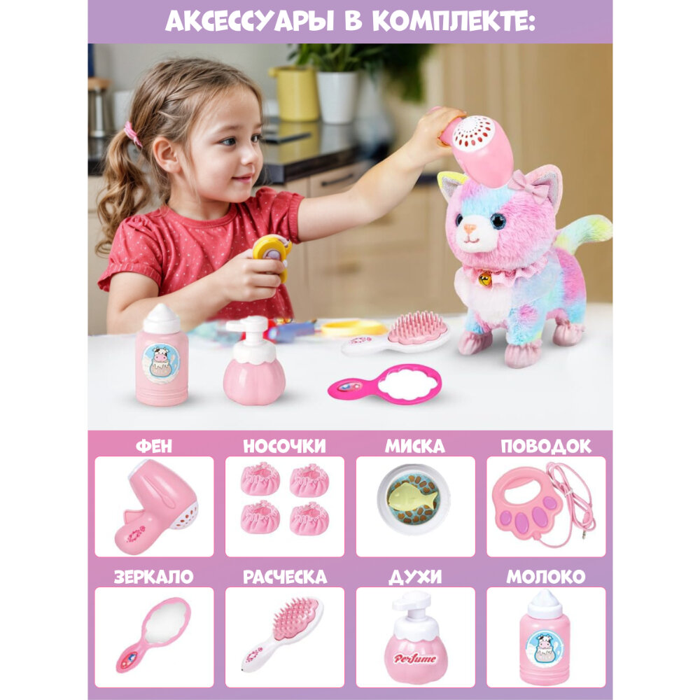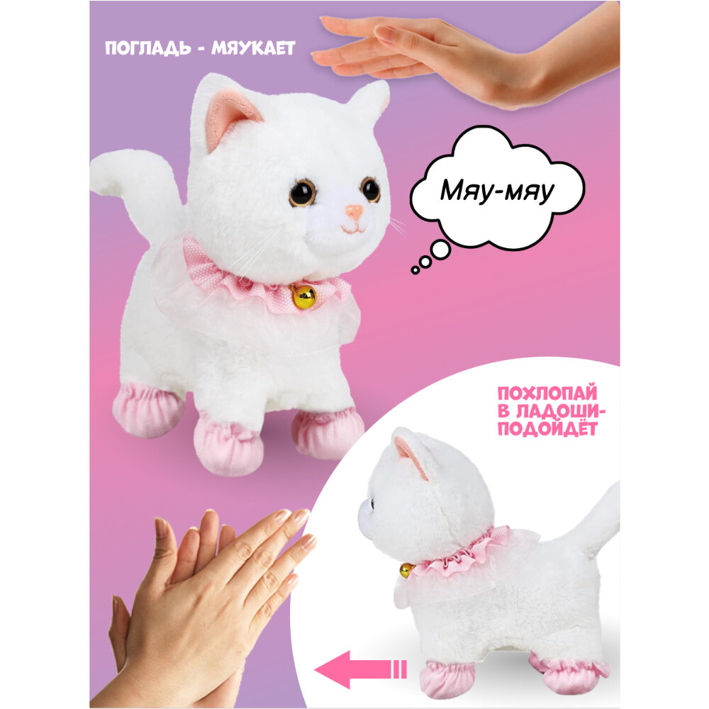 Купить Интерактивная мягкая игрушка для детей Белая кошка робот с поводком на батарейках, ходит, мяукает, с аксессуарами с доставкой по всей России.