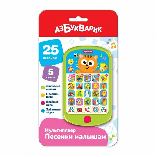 Забавный котенок приглашает малышей петь, танцевать и веселиться! Нажимая на яркие кнопки этого модного смартфончика, дети смогут послушать 17 песенок-хитов («Котенок-веселушка», «Как чудесно жить на свете», «У друзей нет выходных», «Чунга-чанга», «Лето», «С днём рожденья!», «Жил да был весёлый ёжик», «Что на завтрак у лягушки?», «Праздник веселей с гитарой» и др.), 3 обучающие песенки, 5 народных сказок («Заяц и черепаха», «Петушок и бобовое зернышко», «Пузырь, соломинка и лапоть», «Лиса и журавль», «Колосок»), голоса зверят и веселые звуки.