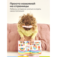 Игрушка изготовлена из плотного картона, что обеспечивает долговечность и сохранность страниц даже при активном использовании. Все 22 страницы книжки интерактивны: можно нажимать на желтые кружочки и слушать звуки, узнавать много интересного и выполнять задания.