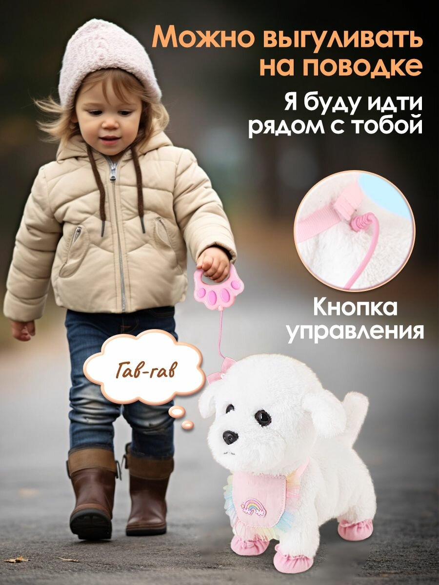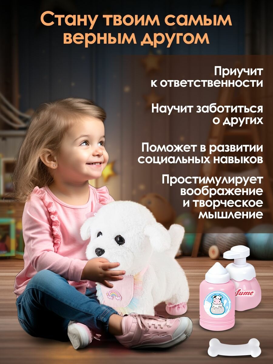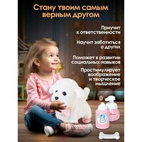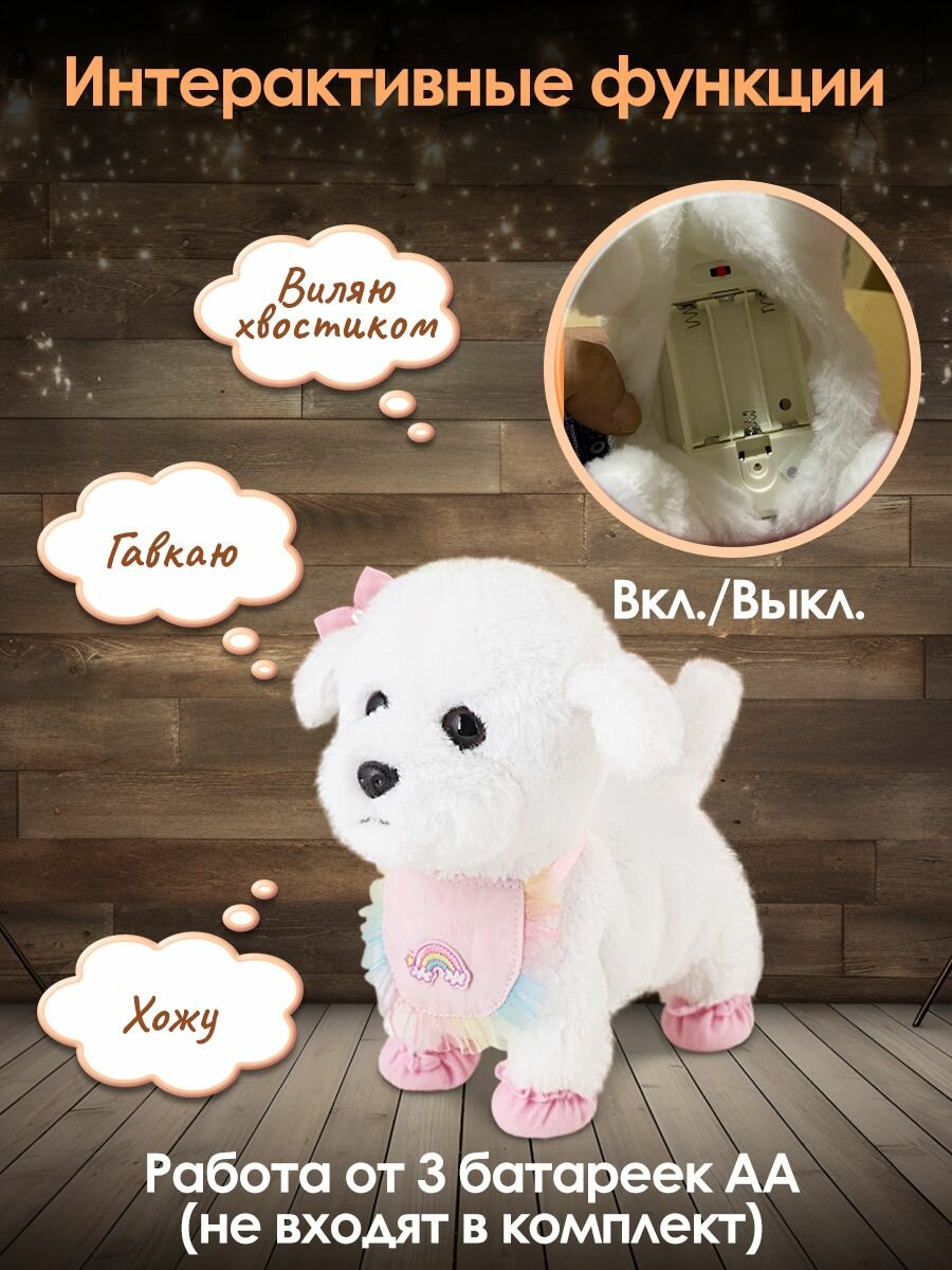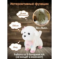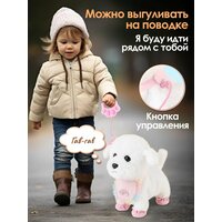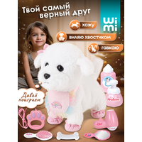 Интерактивная собака WiMi превратит любую игру в настоящее приключение! Она объединяет в себе все самые лучшие качества мягкой игрушки и живого питомца. Щенок на поводке будет вашим верным другом, который удивит своим реалистичным поведением. Маленький бишон-фризе невероятно милый и пушистый. Он не только ходит и лает, но и виляет хвостиком, качает головой, а также реагирует на хлопки и поглаживания. Необычная собачка станет идеальным подарком, который привнесет в жизнь вашей семьи радость и улыбки. Она не только развлекательная и интересная, но и обучающая. Учит мальчиков и девочек ответственности и заботе о домашних животных. Совершенствует внимание, воображение и визуальное восприятие, вырабатывая социальные навыки у малышей. Управление собакой осуществляется с помощью кнопки, расположенной на поводке. Для работы необходимо всего 3 батарейки АА типа (не входят в комплект). Для полного погружения в игровой процесс в наборе предусмотрены различные аксессуары для ухода за игрушечным существом. Шерсть можно причесывать расческой, «просушить» феном перед зеркалом, украсить собачку съемным бантиком. Покормить, используя косточку, слюнявчик и бутылочку. В случае загрязнения плюшевую шерстку снять и постирать. Развивающая собака будет вашим компаньоном. Дети любого возраста будут в восторге от такой умной игрушки.