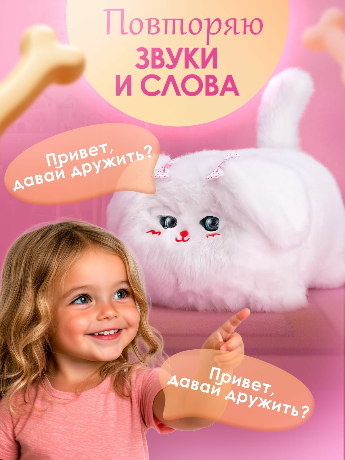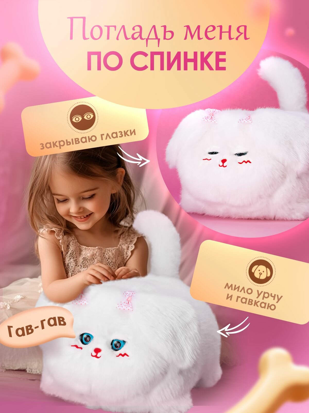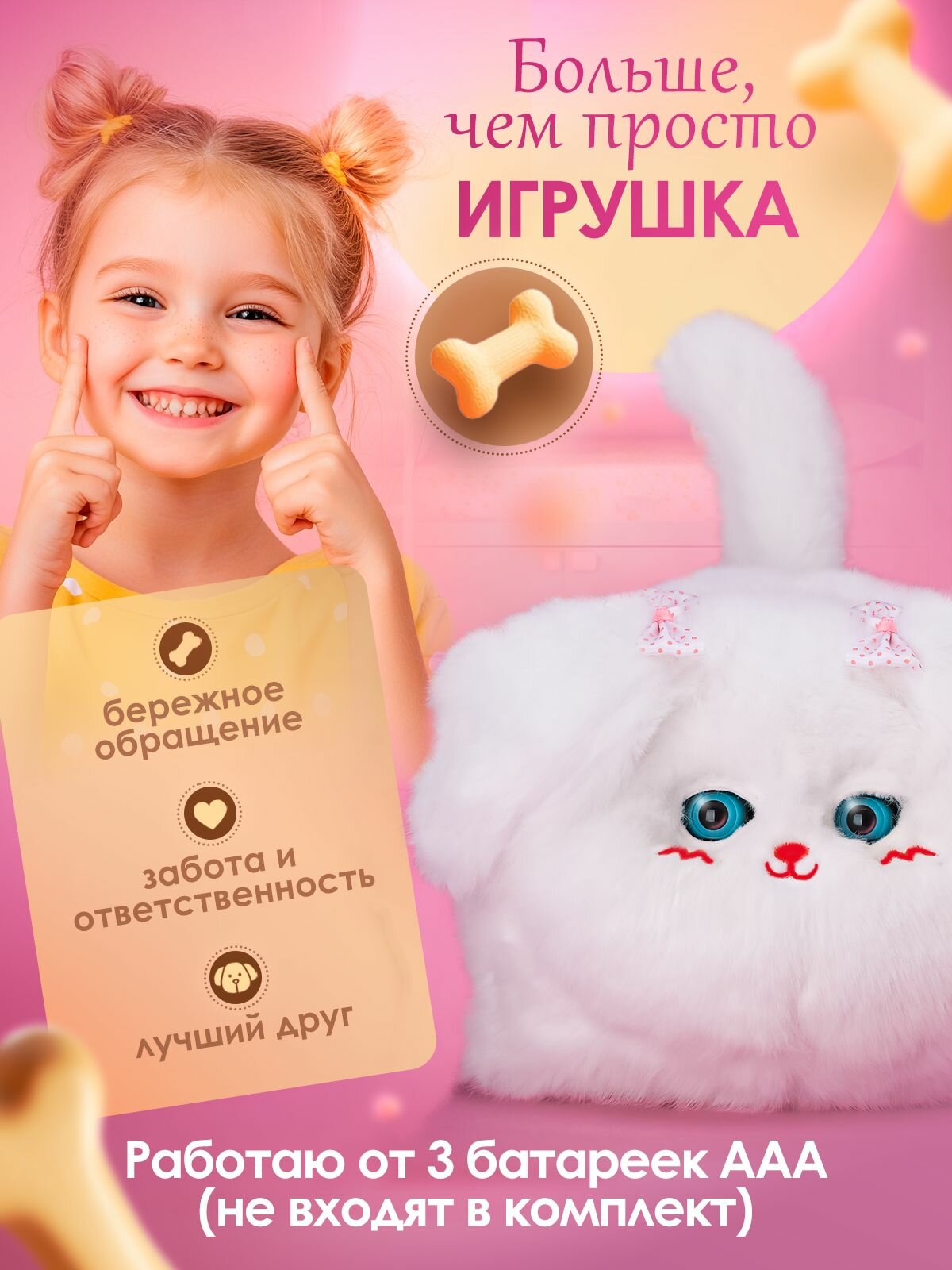 Игрушечное домашнее животное подойдет как для мальчика, так и для девочек. Веселый пушистый друг отлично впишется в любые игровые сценарии. Его можно взять с собой в садик или весело проводить время дома.
