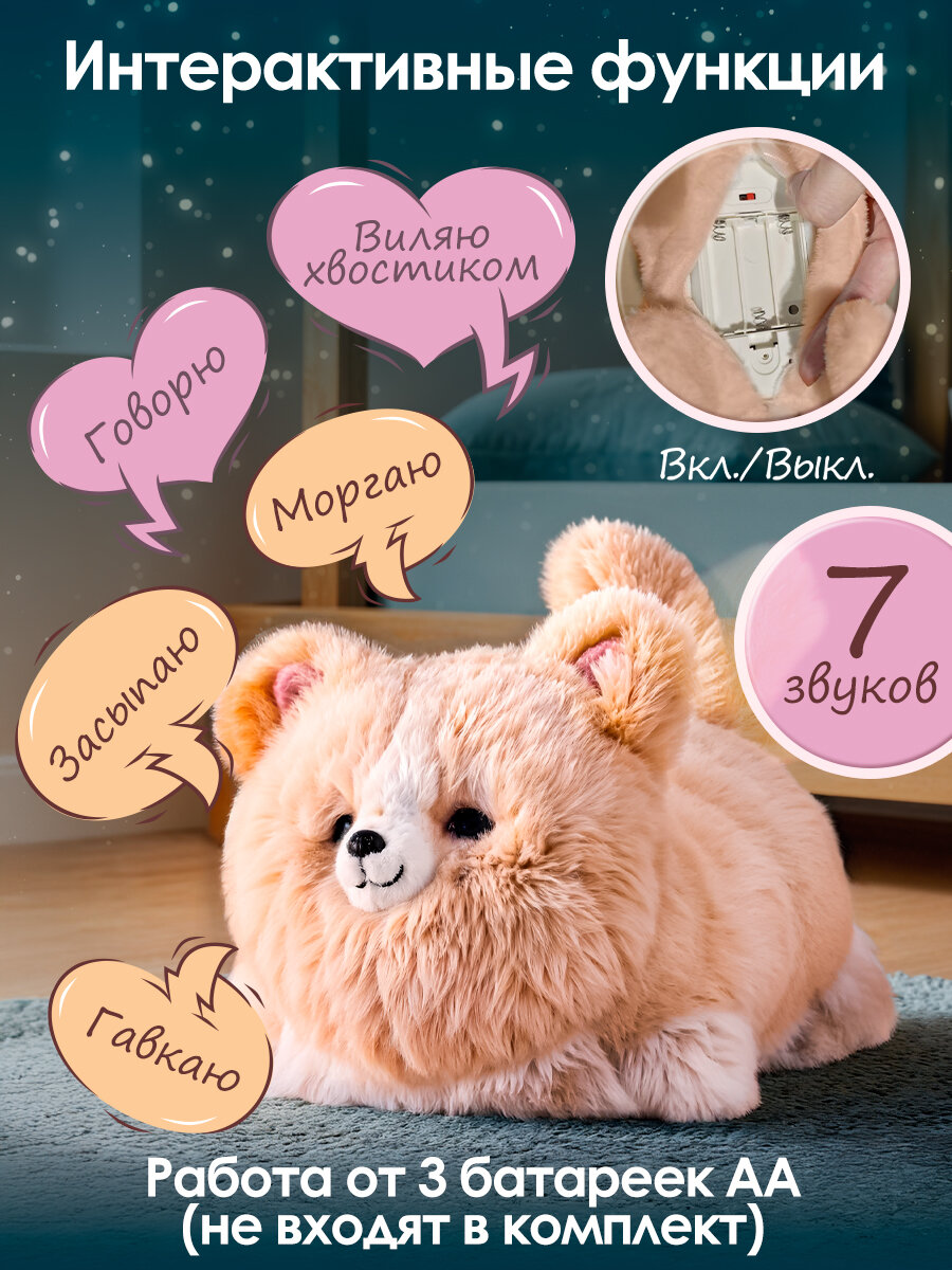 Обладает следующими интерактивными функциями: гавкает и моргает. Будет засыпать вместе с малышом. Для этого уложите щеночка на левый бочок или на спинку, он закроет глазки и уснет. Удерживайте руку возле головы, поступит звуковой сигнал, после него он будет дублировать то, что вы ему говорите. Если погладить его по спине или обнять - он издаст звуки. Работает на 3 батарейках АА (нет в комплекте).