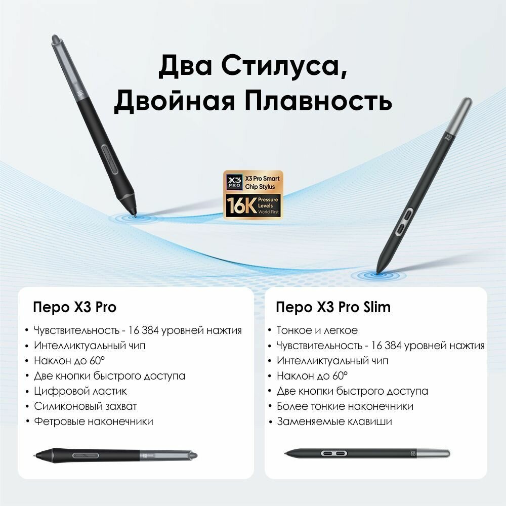 Перья серии X3 Pro поддерживают распознавание ID пера. Можно настроить различные клавиши быстрого доступа в соответствии с личными потребностями. В комплекте идет пылезащищенный футляр, предназначенный для хранения перьев и других аксессуаров. В верхнюю часть дисплея можно установить держатели для перьев. Один предназначен для пера X3 Pro и может хранить до трех наконечников. Другой - для пера X3 Pro Slim. Держатели легко отсоединяются и устанавливаются без каких-либо инструментов.