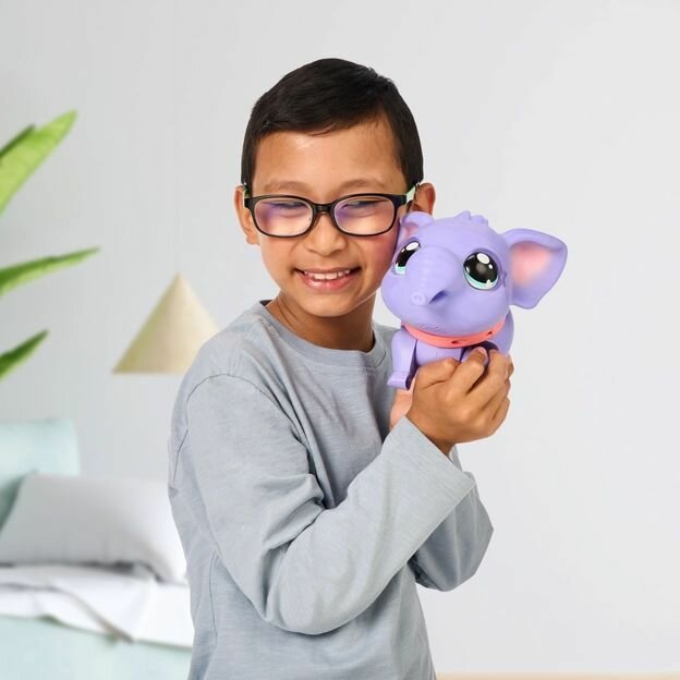 - Слоненок воспроизводит более 25 звуков и реакций, что делает каждое взаимодействие с ним увлекательным и по-настоящему живым;