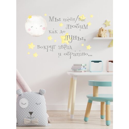 Наклейка надпись на стену интерьерная Мы любим до Луны и обратно с акварельной Луной в короне и звездочками. В комплекте наклеек на стену сразу два слова "тебя" и "вас". В зависимости от того один у вас ребенок или несколько, выберите какое слово на стену приклеить. Размер элементов на фото 2. Наклейки детские надпись, луна и звездочки Вы можете расположить в произвольном порядке на любом расстоянии друг от друга и скорректировать площадь занимаемой поверхности. Наклейки на стену подходят для любого помещения. Идеальное украшение стены для детской комнаты или спальни родителй в зоне, где стоит детская кроватка. Так же декоративная наклейка очень мило смотрится в игровой зоне. Подарок ребенку на день рождения или на новоселье. Презент родителям на рождение ребенка, на выписку из роддома. Милые наклейки имеют нежные пастельные тона, которые впишутся в любой интерьер, сделают его особенным. Виниловые стикеры с рисунком очень красиво смотрятся на однотонных обоях - акценты на стене притягивают взгляд. Интерьерный декор удивит Ваших гостей. Наклейки для малышей или наклейки для деток постарше влагостойкие, их можно мыть и использовать в любой комнате, в том числе на кухне и в ванной. Наклейки в детский сад так же можно использовать, т. к они хорошо держаться на любой гладкой поверхности и легки в уходе. Наклейка на дверь или наклейка на мебель или наклейка на шкаф или наклейки для окон - для стикеров подойдет любая ровная поверхность. Стикеры декоративные упакованы в фирменную упаковку, которая сохранит целостность наклеек во время транспортировки, а так же послужит хорошей подарочной упаковкой. Наклейки для мальчиков и наклейки для девочек - декор нейтральный, понравится всем и ни одного малыша не оставят равнодушным. Интерьерные наклейки детские легко наклеить. Для легкой оклейки, ознакомьтесь с инструкцией, она в комплекте. Удалить наклейки без следа можно с любой поверхности, кроме бумаги / бумажных обоев. Виниловые наклейки лучше держатся на гладкой поверхности: виниловые и флизелиновые обои, включая рельефные (в этом случае наклейки могут держаться чуть хуже) или окна или зеркала или ровная твердая мебель или плитка или ламинат. Обновить интерьер без ремонта - это легко и быстро, для этого нужен только декор наклейки от Lisadecor shop. Декор для дома можно использовать для украшения в детском саду или школе, общественных пространствах или кафе и конечно же в детских комнатах на радость вашим любимым деткам!