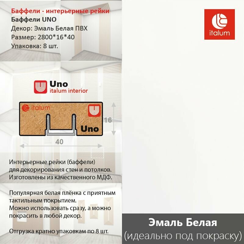 Интерьерные рейки (баффели) UNO в популярном белом декоре "Эмаль Белая", который также идеален для дальнейшей покраски. Можно использовать как есть, а можно красить. Тактильно очень прятный декор. Размер рейки – 2800*40*16, в удобной упаковке по 8 шт.