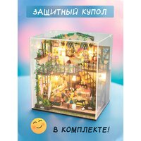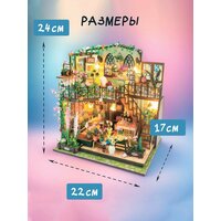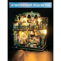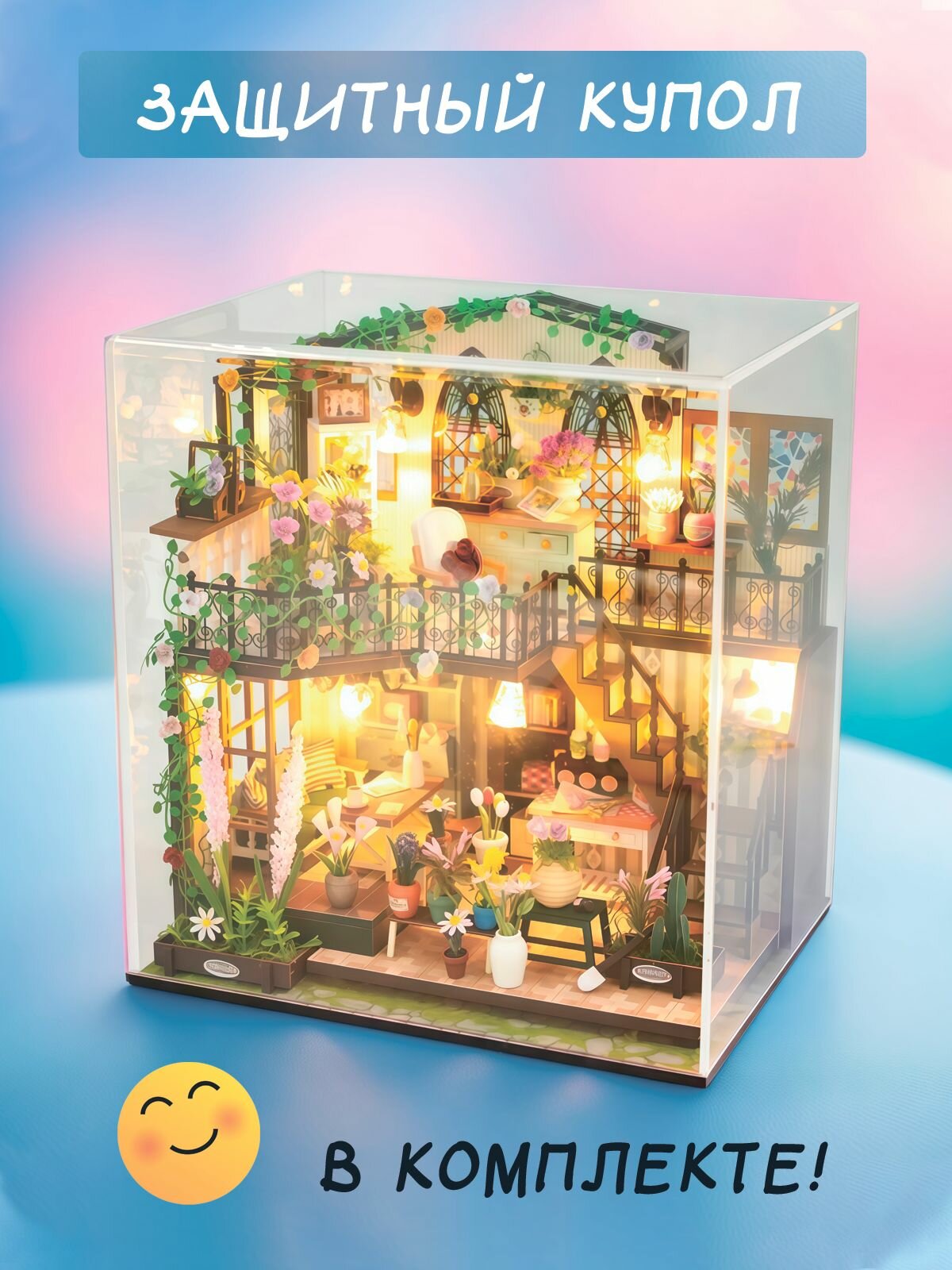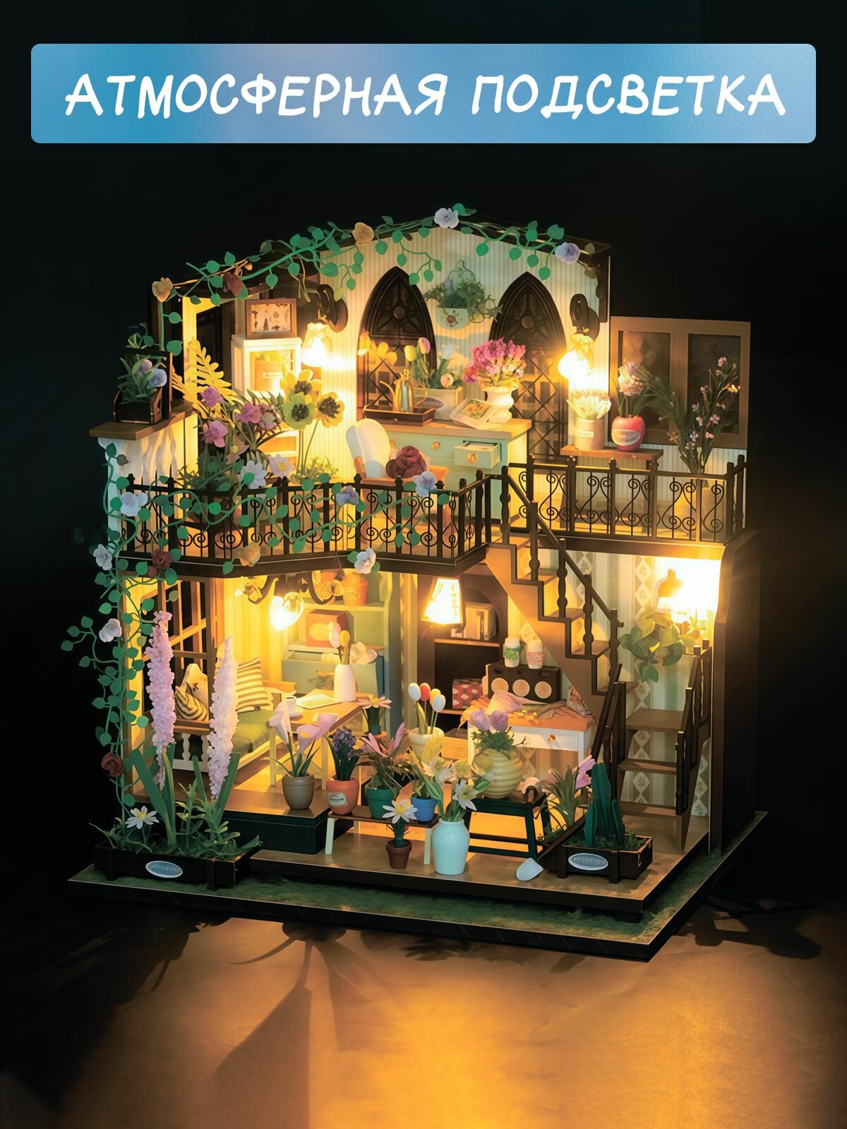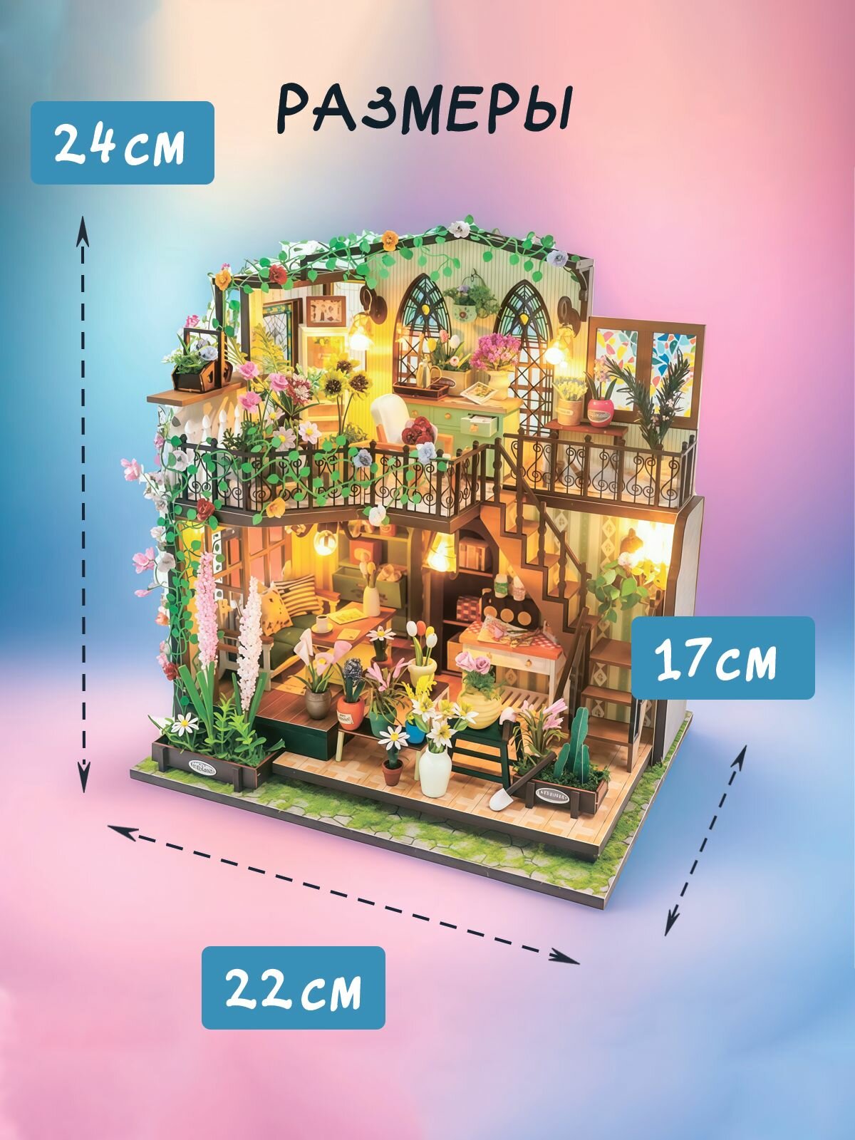 Собранный из высококачественных материалов — дерева, картона, ткани и пластика — он включает миниатюрную мебель, растения, лампочки и декоративные элементы, которые помогают создать реалистичный и уютный мини-сад.