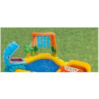 Игровой центр 249х191х109 см "Динозавр" с горкой, распылителем и шарами, 272 л, от 3 лет (Intex 57444). Надувной игровой центр "Динозавр" представляет собой детский игровой комплекс с бассейном, горкой и большой надувной головой динозавра, в которую можно кидать мячи. К игровому центру можно присоединить садовый шланг, и из надувной арки получится водопад а из пальмы забьет фонтан. В комплекте 6 разноцветных пластиковых мячиков диаметром 8 см, съемная надувная горка. Игровой центр предназначен для активных игр одного или двух детей в возрасте от 3 до 6 лет. Характеристики: Размер: 249х191х109 см Объем (16 см): 272 л Максимальная нагрузка: 81 кг Ремонтный комплект Сливной клапан