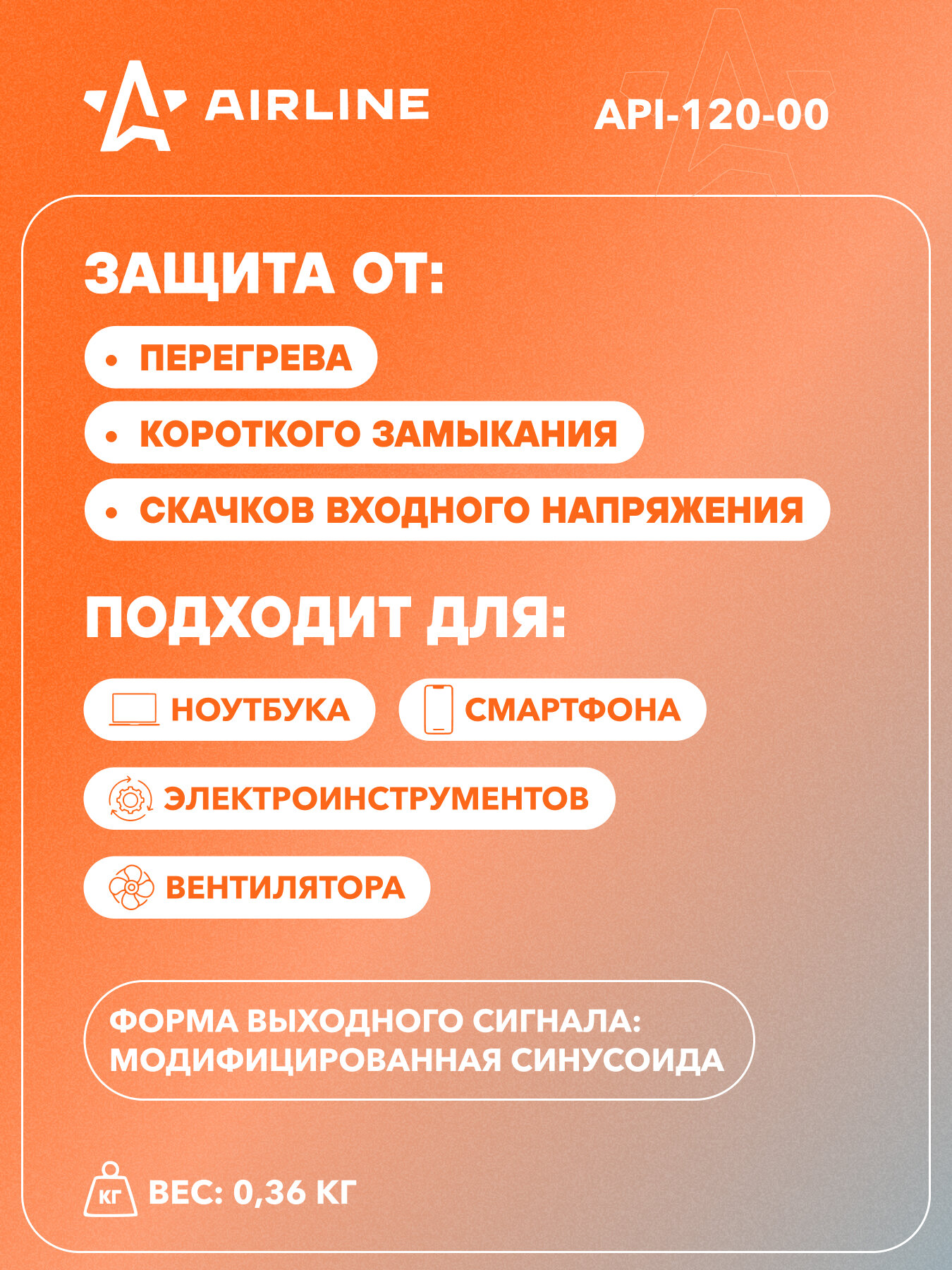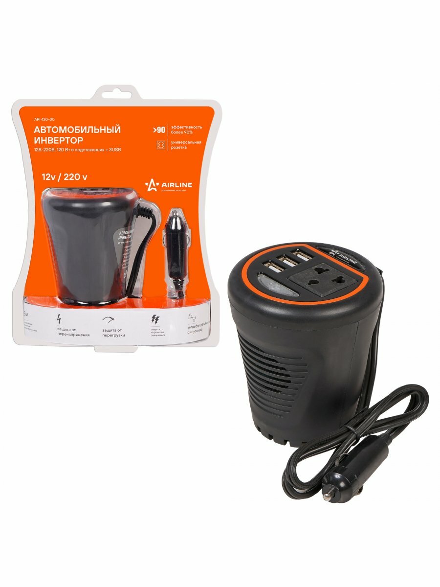 Инвертор автомобильный 12В-220В, 120 Вт в подстаканник + 3USB API-120-00 AIRLINE: сравнение цен, характеристики, фото, актуальное наличие и цены.