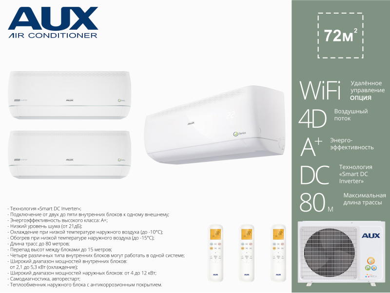 | Подробная комплектация | Наружный блок, внутренний блок(3 шт.), пульт ДУ (3 шт.) |