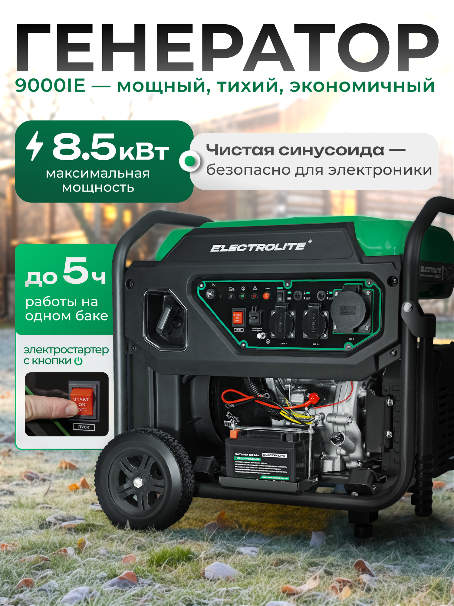Инверторный генератор С электростартером Electrolite EL 9000 IE ( 8,5 кВт, 220В, 420 куб. см ): сравнение цен, характеристики, фото, актуальное наличие и цены.