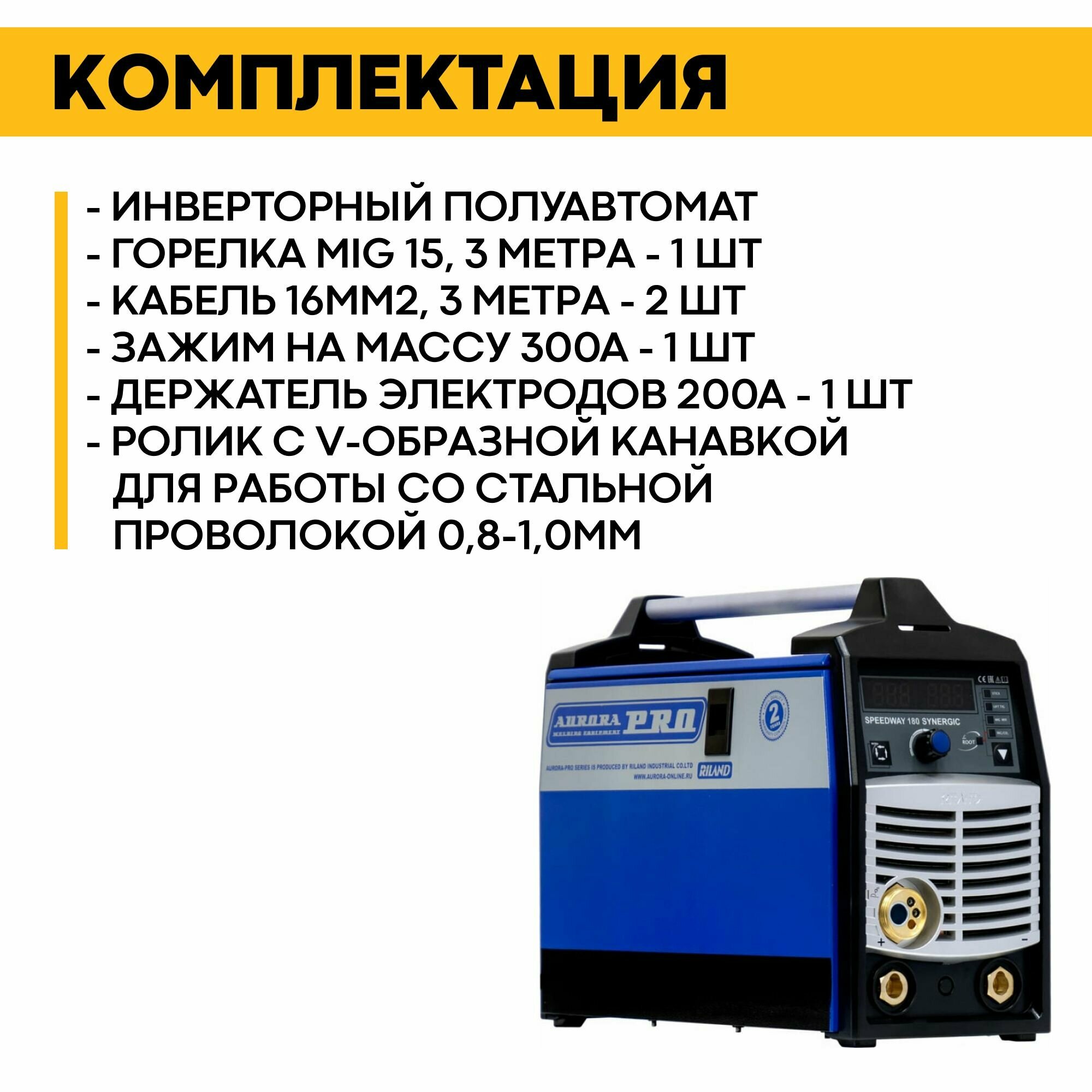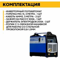 | Комплектация | Сварочный полуавтомат; Горелка MIG 15, 3 метра; Кабель 16mm2, 3 метра, 2 шт.; Зажим на массу 300А; Держатель электродов 200А; Ролик с V-образной канавкой для работы со стальной проволокой 0.8-1.0мм; Упаковка. |