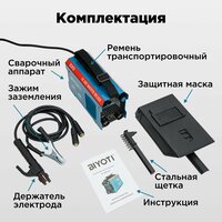 | Комплектация | Сварочный аппарат BIYOTI 220A; Зажим заземления: Держатель электрода; Стальная щетка; Защитная маска; Транспортировочный ремень; Инструкция по эксплуатации. |