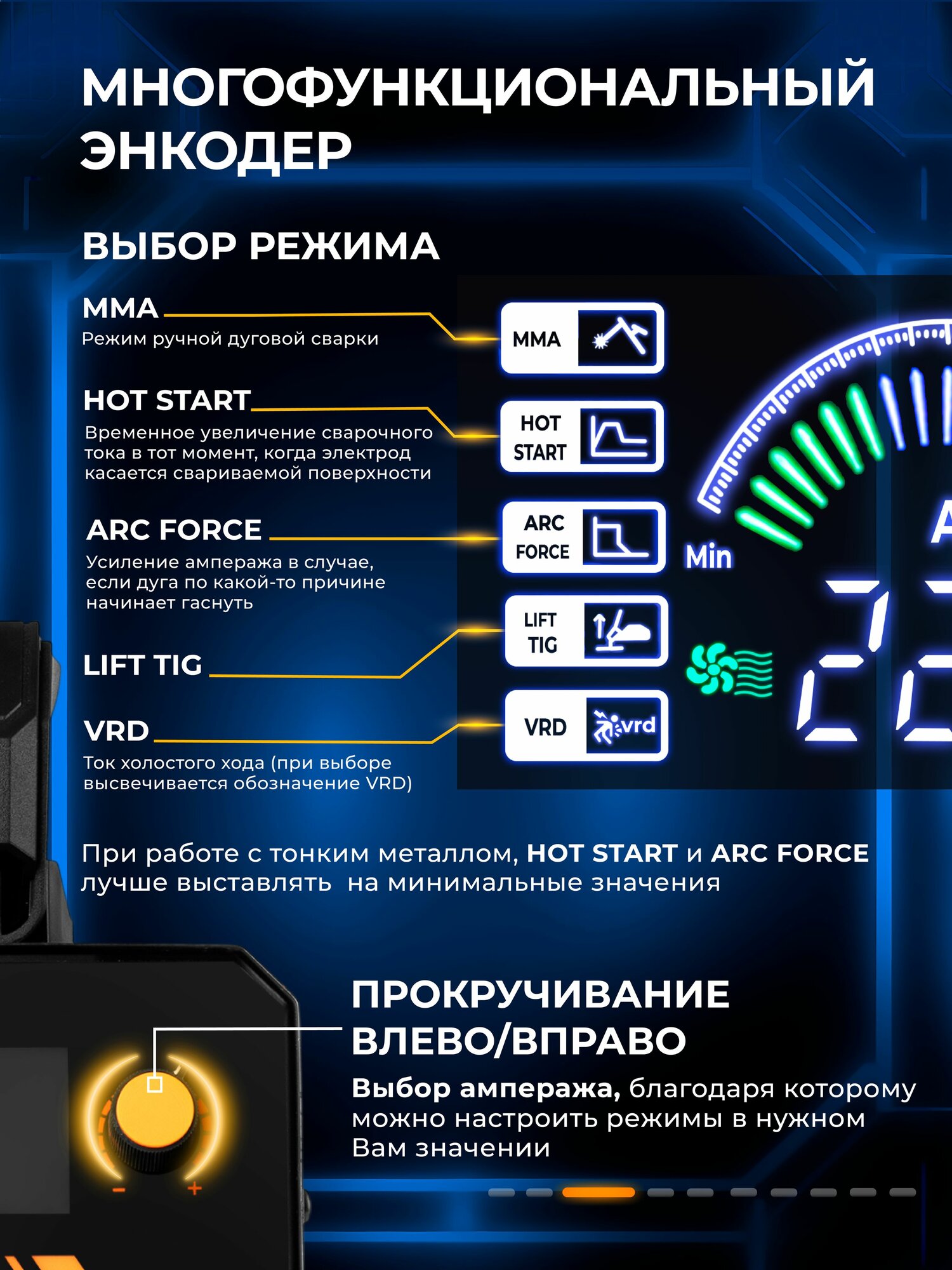 антиприлипание, горячий старт, защита от перегрева, форсаж дуги, функция VRD